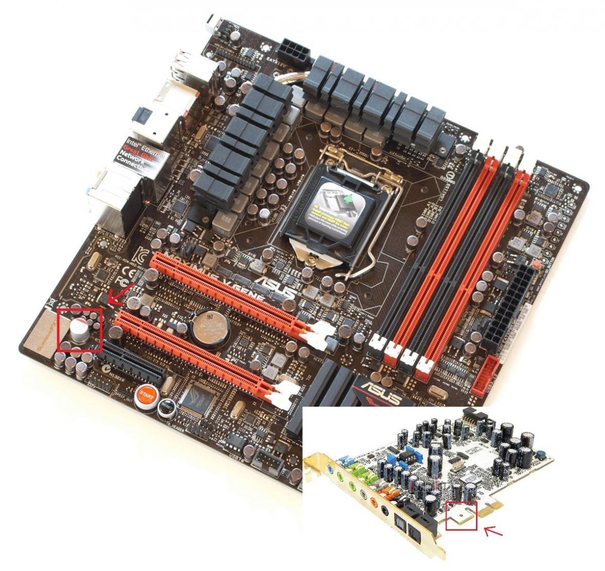 Bei mir stößt da der rechteckige Vorsatz der noch vor dem Kontaktpins der Soundkarte ist mit dem Stützkondensator des Onboardsounds zusammen :wall: