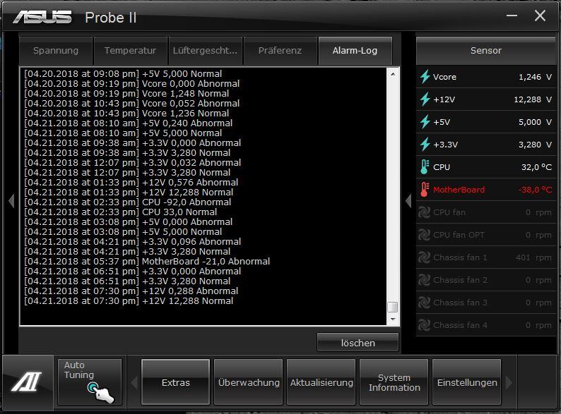 Seit einer Weile, ungefähr Ende Februar, fing die AI Suite plötzlich an kleine Warnfenster anzuzeigen: Mal ist die Mainboard Temperatur bei -63 centigrade (sic!) oder die VCore auf 0,050V, die 12V Leitung hätte angeblich nur 1,259V, usw. usf. Dass die Werte ausgemachter Blödsinn sind, weiß ich, der PC würde mit den Spannungen auf der entsprechenden Leitung direkt mal aus gehen. Auslesefehler sind auch Gang und Gäbe, meistens allerdings schon zu Beginn an. Und hier liegt der Hund begraben: Es lief ca 6 Jahre alles takko.