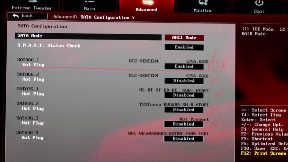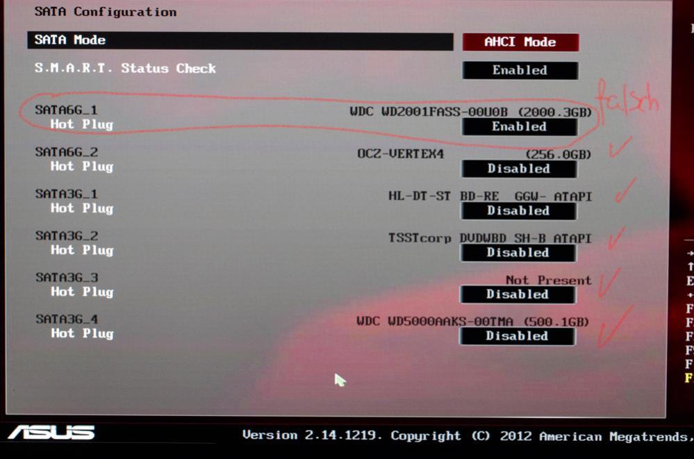 Nach dem Kaltstart war dies auch richtig im BIOS unter Advenced; Satakonfiguration eingetragen! Aber nach einem Neustart, sah ich dann im BIOS, dass angeblich auf der ersten Intel SATA6GB/s meine WesternDigital Festplatte (2000GB) angschlossen sein sollte, was ja nicht stimmt! Die ist am ASMedia SATA 6GB/S angeschlossen (rot unten)