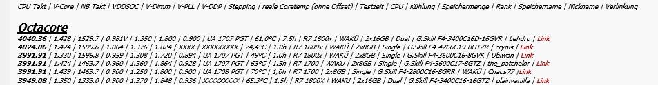 Den Thread kenne ich, danke. Allerdings klappt das bei meiner CPU nicht mit den Werten. Da sind Leute auf der ersten Seite die 4 GHz mit 1.330v fahren, das bekomme ich nicht mal mit 1,45v hin...