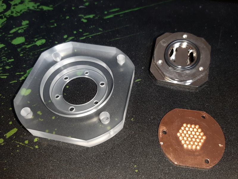 Der Northbridgekühler ist ein Heatkiller, nur die doofen Haltebügel sind einem 20min Drehbank-Acryl-Teil gewichen, gefertigt aus Verschnitt.
