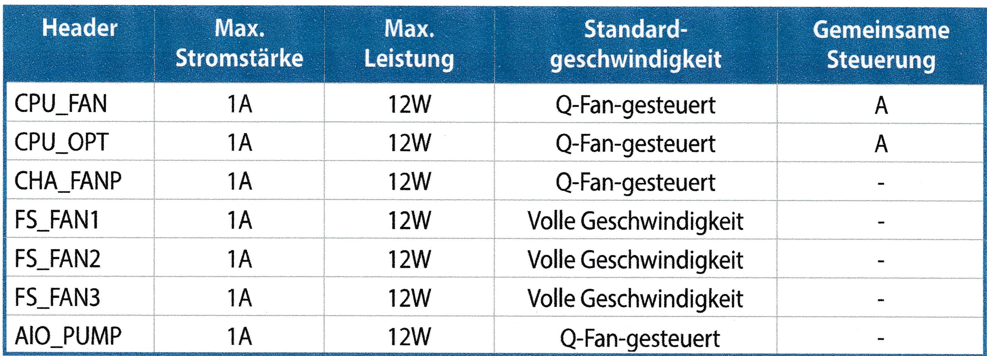 Gene: Es sind nur CPU_FAN, CPU_OPT und CHA_FANP regelbar. Die Belastbarkeit pro Anschluss beträgt 12W.