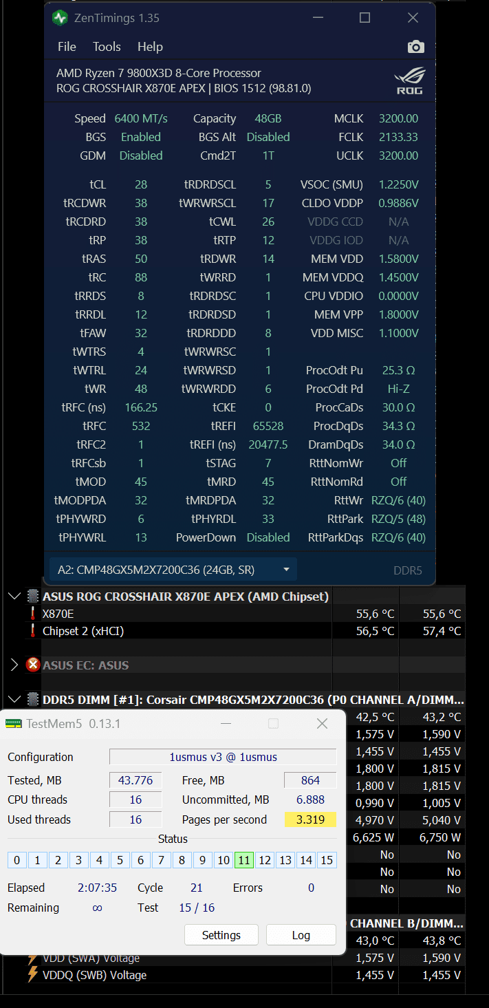Ich hatte mal Karhu mit einem 32 GB Kit auf dem 7800x3D (schlechter A-DIE Bin von G.Skill) laufen gelassen - 2x bis 33.333% und Anta777 ebenfalls über Nacht. Veii meinte zu mir, ich solle (UBER) 1usmus lieber zum Testen nehmen.Direkt nach dem DDR5 Ryzen3D dann halt auch diesen UBER 1usmus. Heute Nacht ggf noch Karhu.