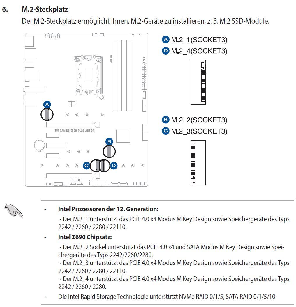 leider hab ich keinen TUF GAMING Z690-PLUS WIFI D4 Sammelthread gefunden, daher stelle ich die Z690 Frage hier einfach mal. Das TUF GAMING Z690-PLUS WIFI D4 hat insgesamt 4x M.2 Slots und im Handbuch steht dazu folgendes: