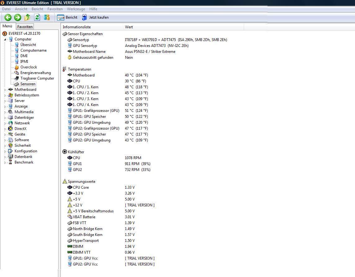 Also mein CPU-Lüfter befindet sich voll im Luftstrom und kühlt ausschließlich den CPU-Kühler. Dafür ist er ja gedacht. Das Board kühlt ausschließlich der "Luftstrom", der durch die 2 120er Lüfter zum Einblasen entsteht. Die warme Abluft zieht ein 120er hinten und ein 210ner!! oben raus aus dem Gehäuse. Und natürlich das NT, welches unten im Gehäuse sitzt! Zusätzlich könnte ich noch nen 120er an der Seite anbringen zum Reinblasen und kühlen von Graka+NT. Das ist aber net nötig, da die anderen (vorinstallierten!) Lüfter ihre Arbeit perfekt verrichten. Und wie "kühl" es da drinne im Gehäuse ist sieht man am folgenden Bild. Schaue dir (euch) mal die "Temperatur 3" an. Die ist eine von den 3 beim Zubehör enthaltenen Temperaturfühlern des Striker und diese habe ich "im Luftstrom" hängend unweit des großen G platziert!!! Am besten ihr stellt das mal nach. Und ich wette, das alle Leute welche NICHT15/XX Bios druff haben und MCP-Temp. über 60° gar 70° haben, im idle mit no oc da wesentlich höhere Temps wie meiner einer haben!!! Daraus würde ich dann schlußfolgern, das manche zwar denken sie hätten ein gut durchlüftetes Gehäuse, es in Wirklichkeit aber eventuell eine "Mogelpackung" sein könnte. Versteht mich bitte nicht falsch, ist net böse gemeint!!! Mein "Altes Gehäuse" hatte sogar 6 Lüfter drinne, die waren aber so "unglücklich" platziert, so das es KEINEN Luftstrom gab, sondern NUR Verwirbelungen. Folge -> hohe Temps.!!!