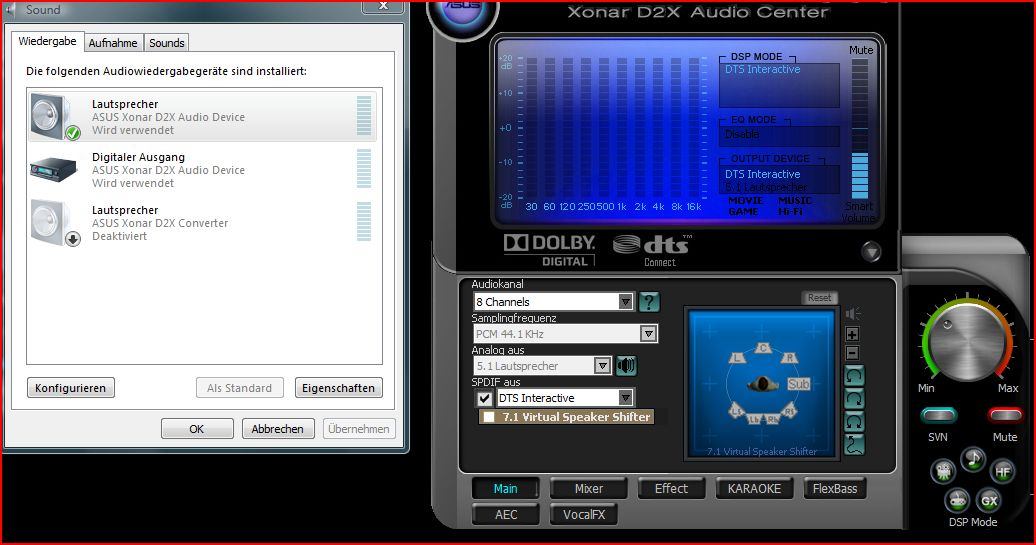 Hab meine Xonar D2X jetzt analog UND Digital angeschlossen ... wenn ich COD4 zocke (im Spielemenü habe ich 5.1 Sound ausgewählt) und ANALOG gehe, dann habe ich nach kurzer Zeit ein leises aber deutlich wahrnehmabres Rauschen/Knistern in den Boxen ... wenn ich Digital einstelle in der XOnarSoftware, dann habe ich das nicht! (@z5500) Musik hören geht analog und digital ohne Probleme-... hab ich irgendwo was falsch eingestellt?