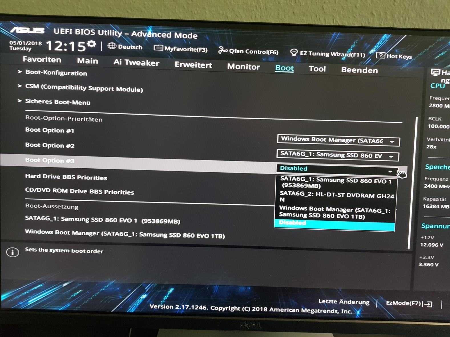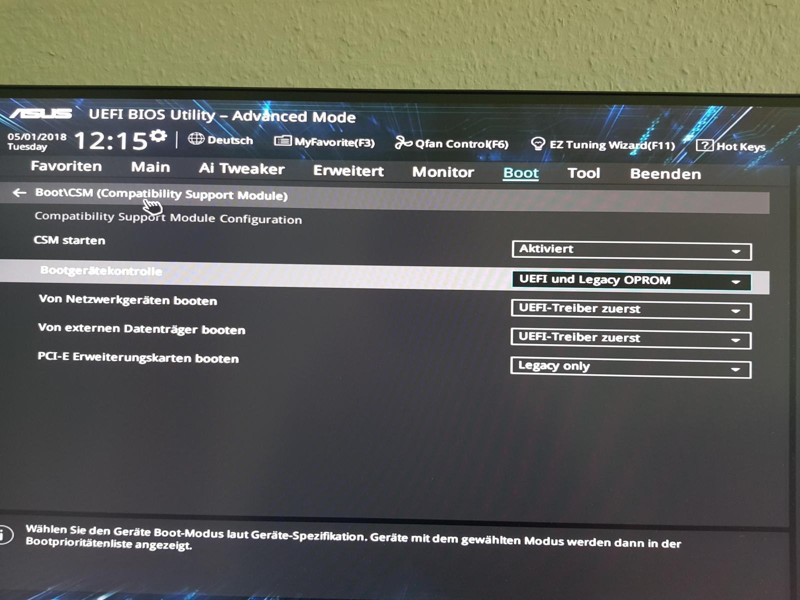 seit ich heute das Update auf die neue UEFI Version bei meinem Asus Z370-P durchgeführt habe taucht die Option extern von DVD-ROM oder USB im UEFI Modus zu starten weder im UEFI Setup selbst, noch im Bootmenü auf, obwohl ich die entsprechenden Optionen so konfiguriert habe wie vorher auch.