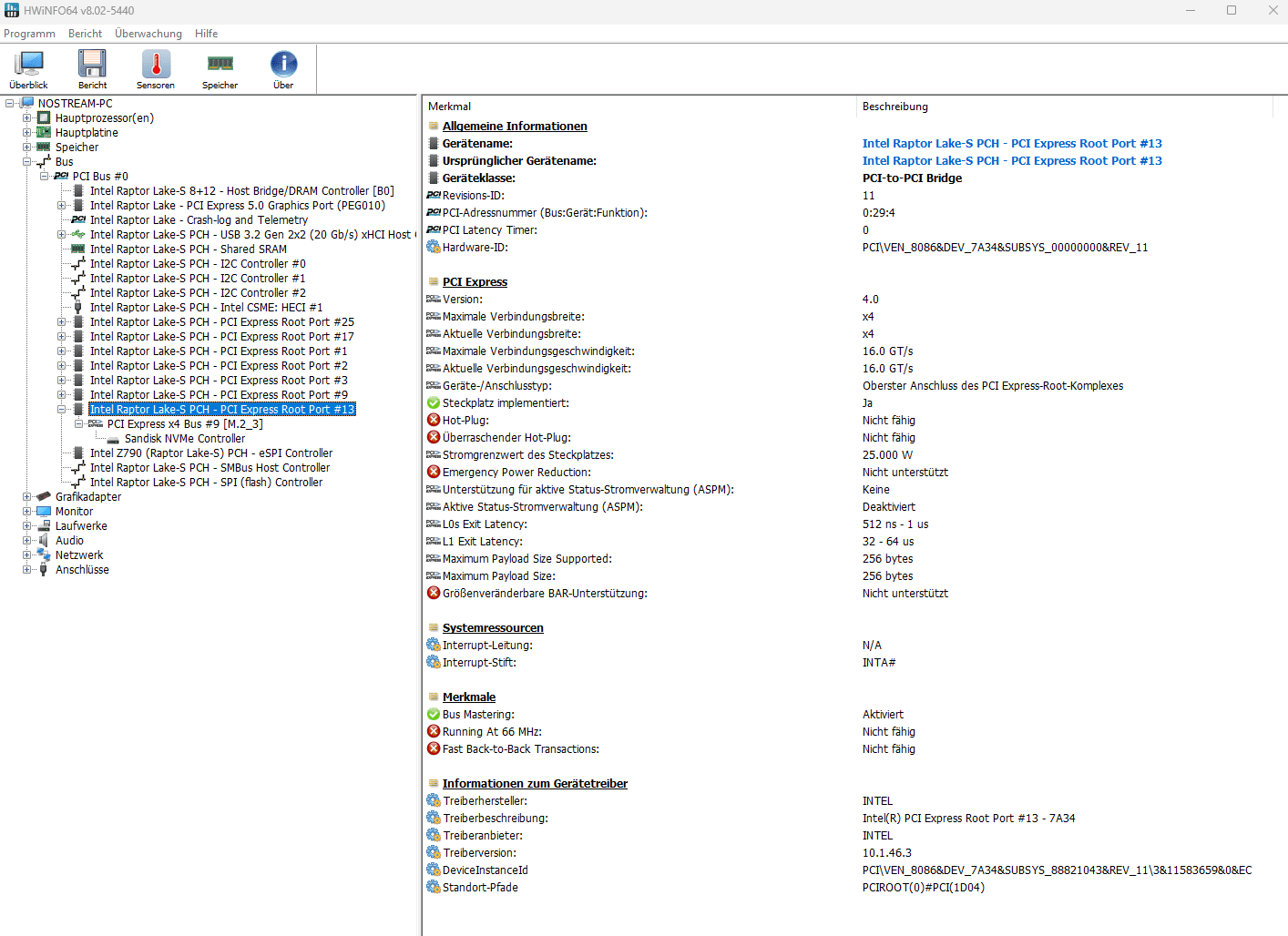 Gemäß UEFI, HWinfo und WD-Dashboard läuft die WD am PCH NVMe-Slot M.2_3 des Asus mit x4 Gen4 und einer Maximum Payload Size von 256 bytes: