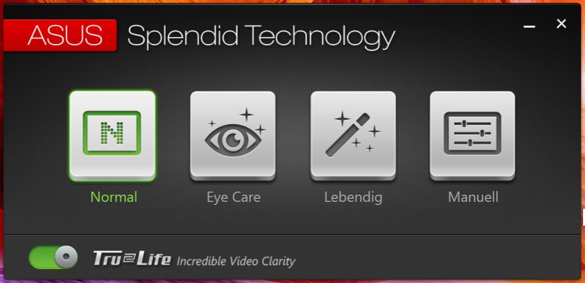 Was der Audio Wizard für die Lautsprecher ist, ist Splendid Utility für den Bildschirm. Es können verschiedene vorhandene Farbmodi ausgewählt werden, alternativ kann man die Farbtemperatur des Displays händisch einstellen.