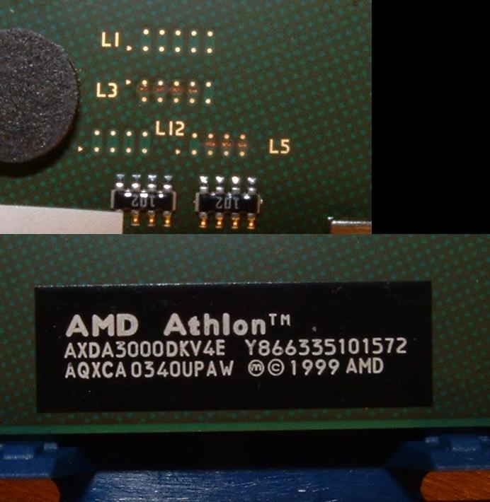 Dazu brauche ich jetzt eure Hilfe! Wie man auf dem Bild erkennen kann ist es ein grüner AMD Athlon XP 3000+ mit Barton Kern, 1,65 V, 512 KB, 400 MHz FSB, AQXCA Stepping aus KW 40 2003. Außerdem sieht man, dass die letzten drei L5 Brücken getrennt sind.