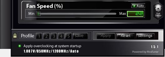 habe bei meiner MSI 5870 mit dem MSI Afterburner (Version 1.60 und Catalyst 10.4) versucht die Lüftersteuerung anzupassen. Es funktioniert aber nur bis zu nächsten Windows-Neustart; dann läuft der Lüfter dauerhaft auf 50 %. An was kann das liegen?
