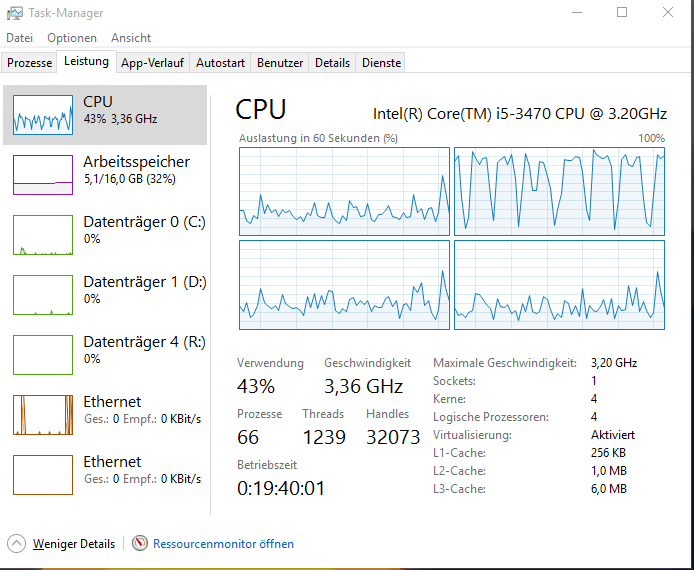 Also im Taskmanager sieht man schon deutlich, dass eine CPU immer wieder ausgelastet wird.