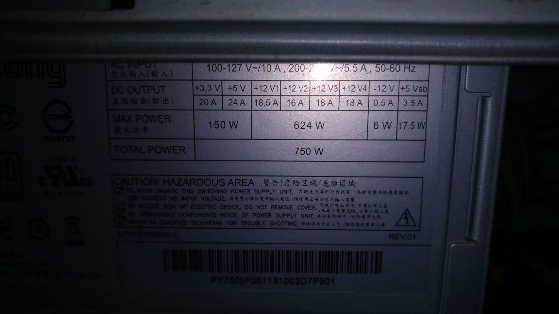 Laut dem Aufkleber meines Netzteils soll dieses 750 Watt Leistung bringen (200-240V steht an der Stelle an welcher der Blitz es verdeckt) :