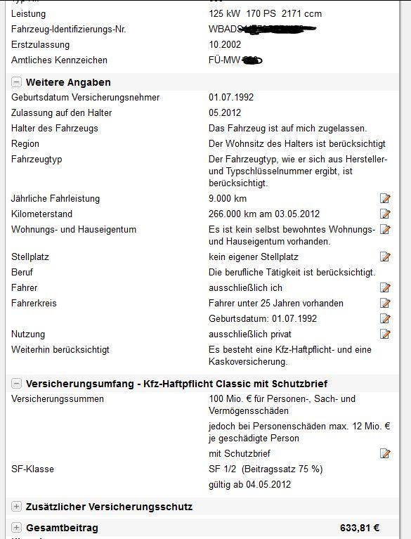 Jetzt ist der Wagen auf meinen Vater versichert, als 2. Wagen bei 85%. Teilkasko 150€ SB, freie Werkstattwahl, 9.000km, Schutzbrief etc. für ~270€ im Quartal...