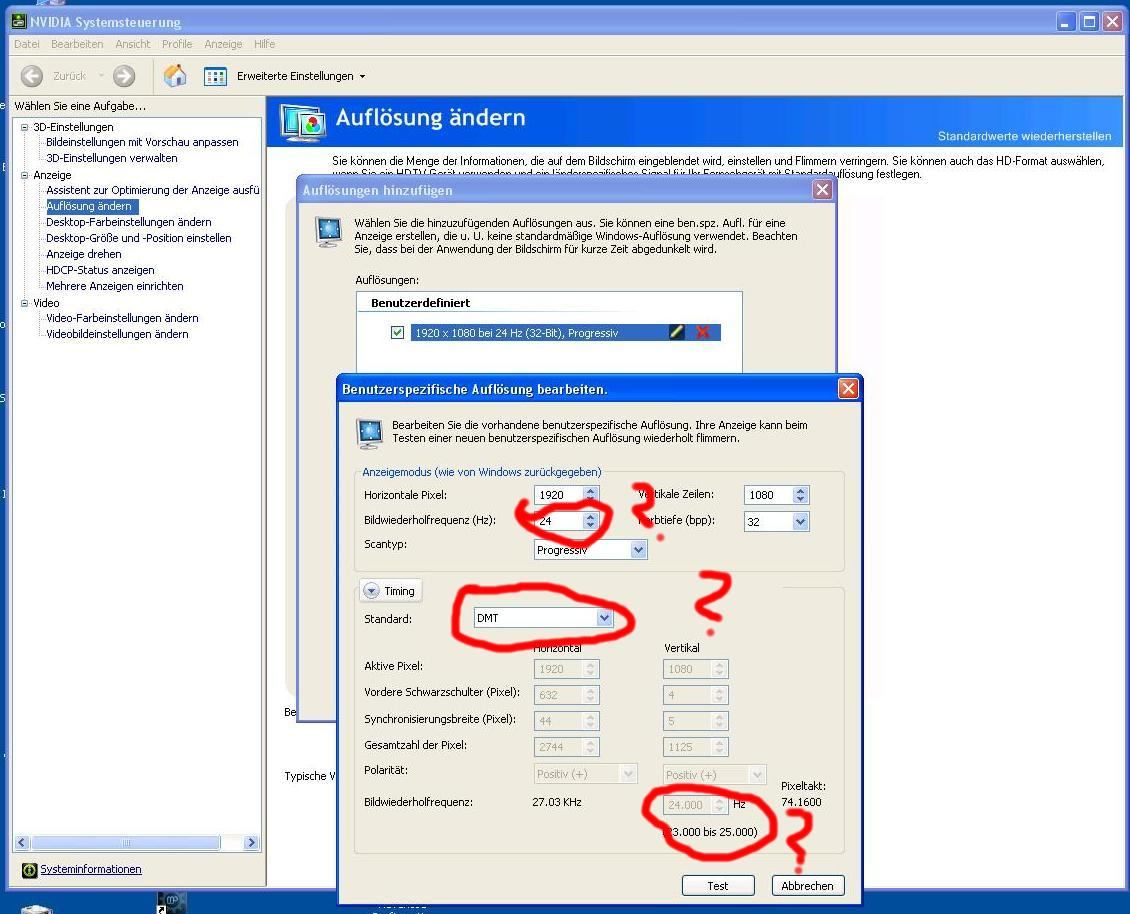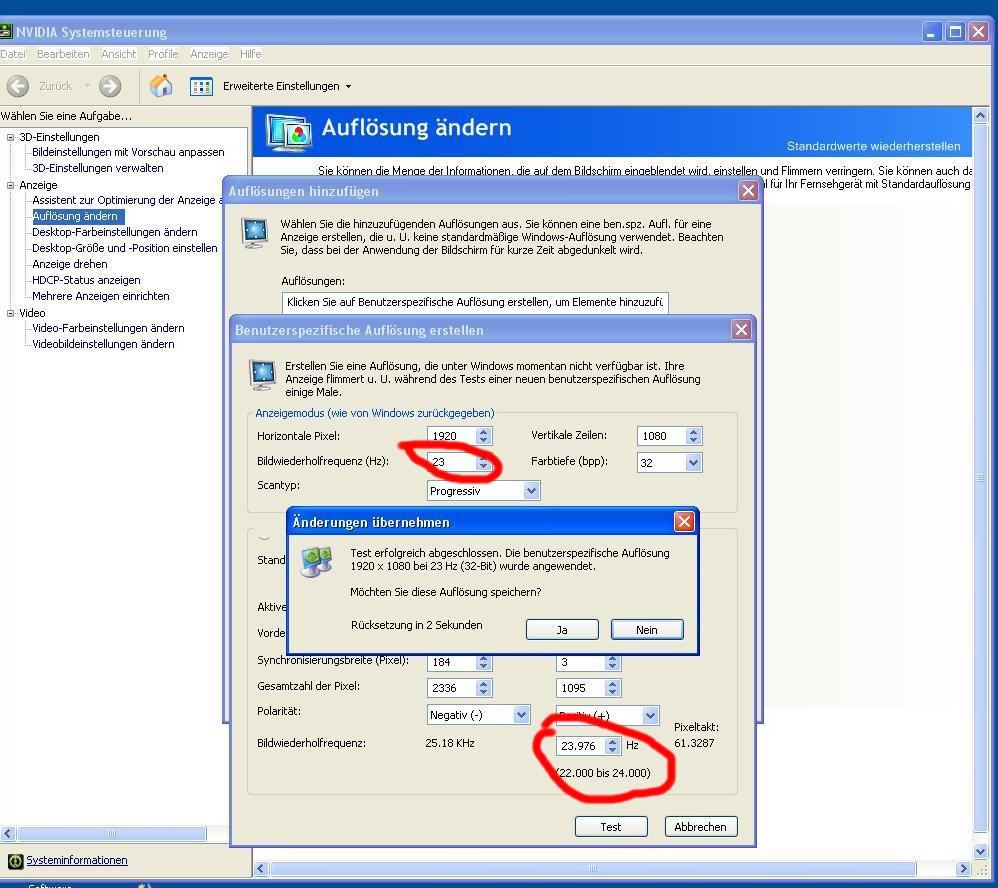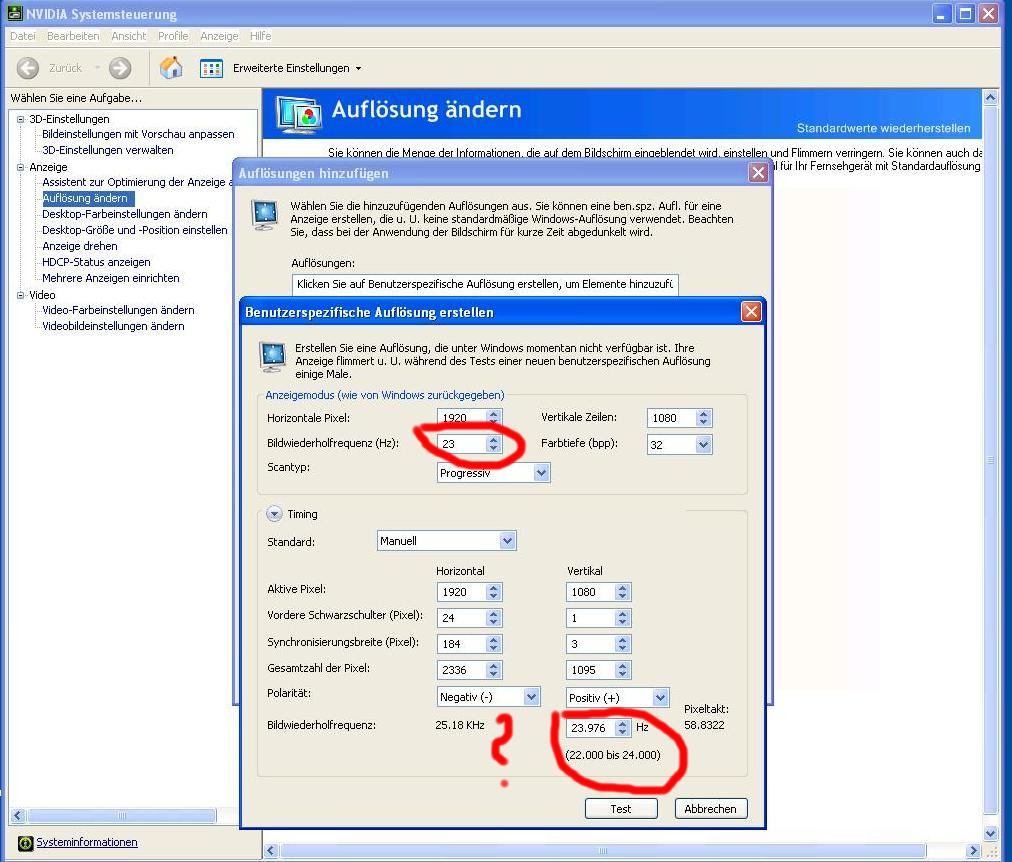 23,976 Hz kann ich da gar nicht hinzufügen, da nur ganze zahlen angenommen werden. wenn ich jetzt da nur 23hz eingebe und auf testen gehe, springt mein tv auf 50hz.