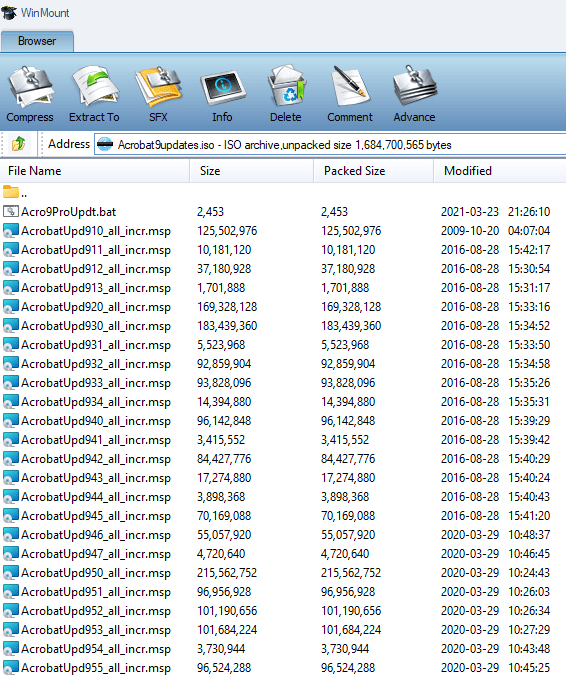 Ich habe die gesamten Updates für Adobe Acrobat 9 als Batch Dateien bekommen, siehe Bild im Anhang.