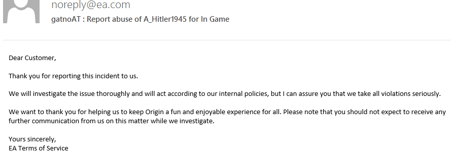 Warum sollte EA ihn auch bannen? Wegen dem Hakenkreuz bzw Nazi zeugs? In vielen Ländern ist das nicht verboten...z.B in den USA kann man doch ganz einfach Nazi Sachen kaufen und auch zeigen. Um ihn wirklich zu bannen müsste EA seine IP überprüfen und schauen ob in dem Land wo er sich befindet Hakenkreuze usw verboten sind..und diese arbeit machen die sich nicht. Das selbe gilt auch bei Steam. Finds aber ehrlich gesagt auch bissel übertrieben..wieso willste den Bannen lassen? Nur wegen dem Symbol? So langsam sollte man doch mal soweit sein und zu seiner geschichte stehen....auch wenn es nicht gerade schön ist was da damals gelaufen ist.