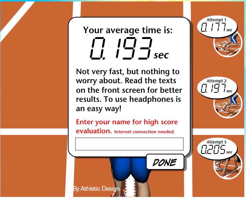 also bin ich im schnitt ~20% langsamer.. aber man könnte das sicher üben - kopfhörer nutzen - und könnte noch ein paar millisekunden rausholen.. war ja jetzt nur der first try