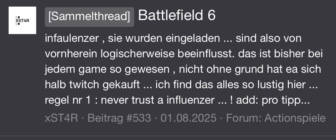 Politik habe ich im „Richtigen“ Leben genug, das brauch ich nicht in meiner Hobby bubble. Und ganz davon ab: schlechter konnte es mit EA kaum werden, mal schauen wie es jetzt wird. So tief wie man Anspruch an EA hat kann es fast nur besser werden :fresse: