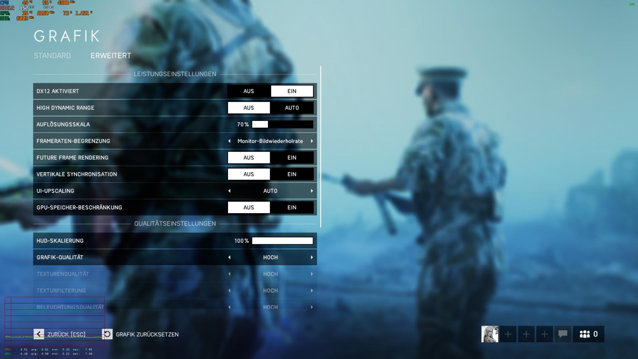 Ich habe mich gestern nochmal einige Stunden mit den Grafiksettings beschäftigt (da es nach dem Update sehr schlecht lief) und mir scheint es so als würde die Gpu bei niedrigen Einstellungen kurz runter takten. Bei aktuell DX12 2560x1440 70% skallierung auf hohen Einstellungen sehr sehr selten hänger. und selten unter 144Fps, meist zwischen 150-170. geht sogar ab und an auf 200 Fps.