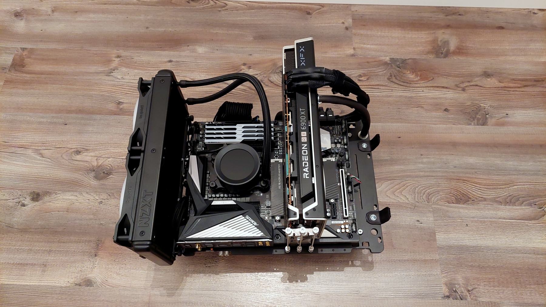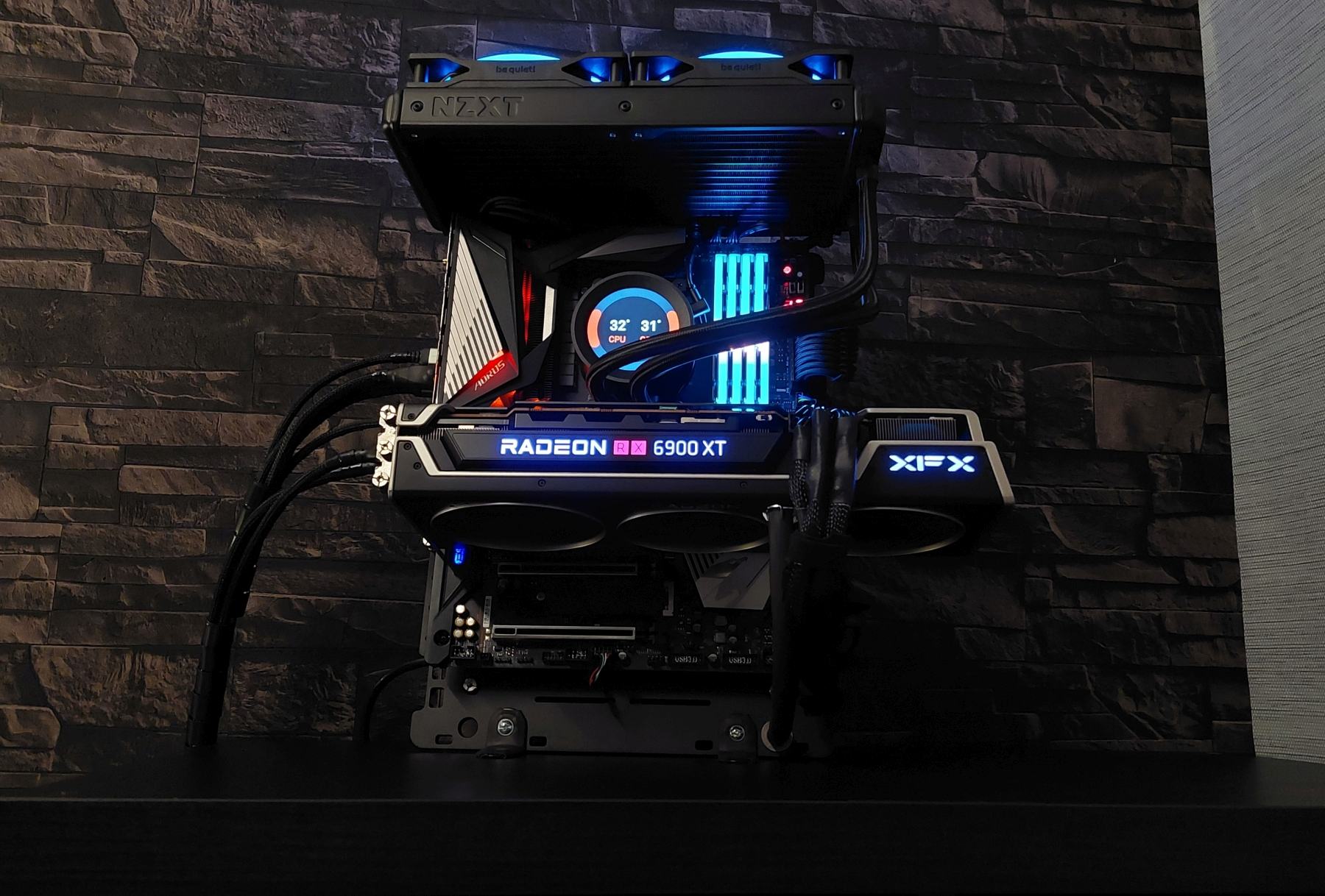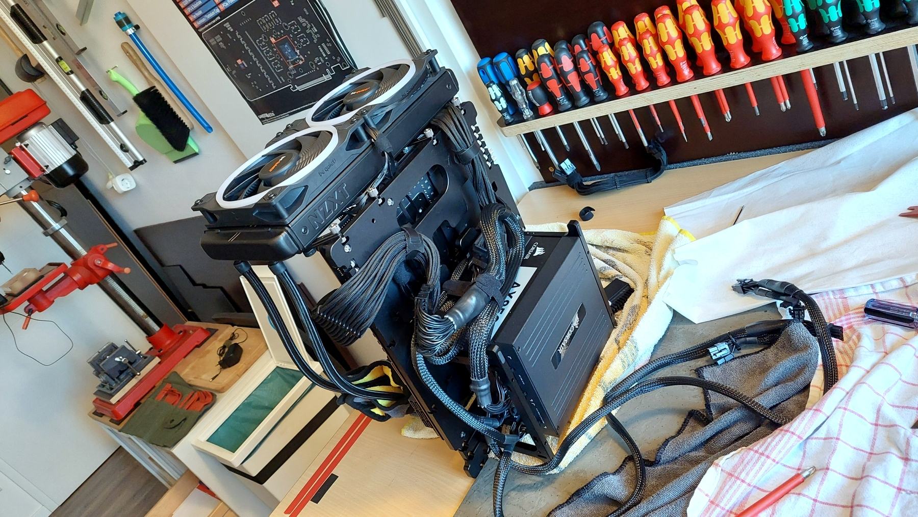 Vertikal macht der Benchtable optisch sehr viel her und ist somit auch als Open-Case für Nicht-Hardware-Tester sehr interessant. Insbesondere, weil die vertikale Montage auf der Homepage als neues Feature der verbesserten V2-Version angepriesen wird. Natürlich hätte ich den Radiator mit den Lüftern nach hinten montieren können. Jedoch möchte ich das nicht, weil mir das zum einen optisch nicht zusagen würde und zum anderen ich deutlich mehr Platz nach hinten haben müsste. Wie auf den Fotos zu sehen, möchte ich aufgrund meiner Kabel und der Optik das System nicht weiter nach vorne schieben. Wie das optisch dann mit den AIO-Schläuchen aussehen würde, weiß ich auch nicht. Im Video von Gear Seekers sieht das jetzt nicht so toll aus. Deswegen bleibt der Radiator vorne, die GPU-Blackplate freut's auch.