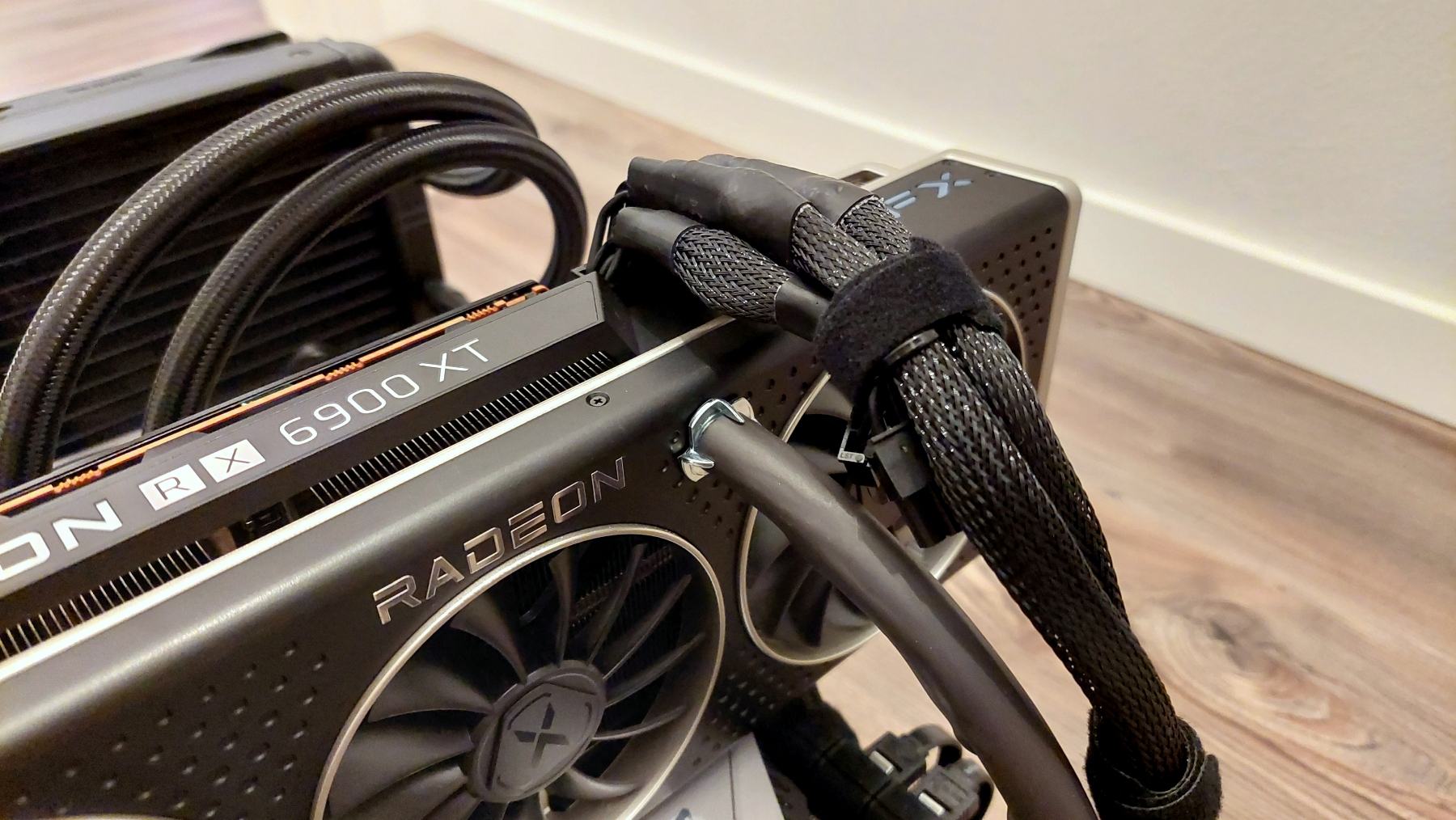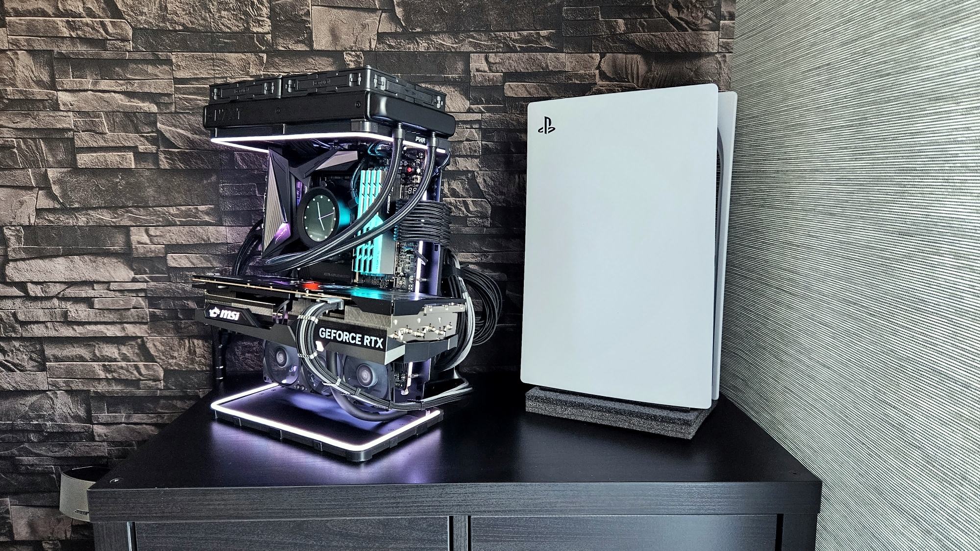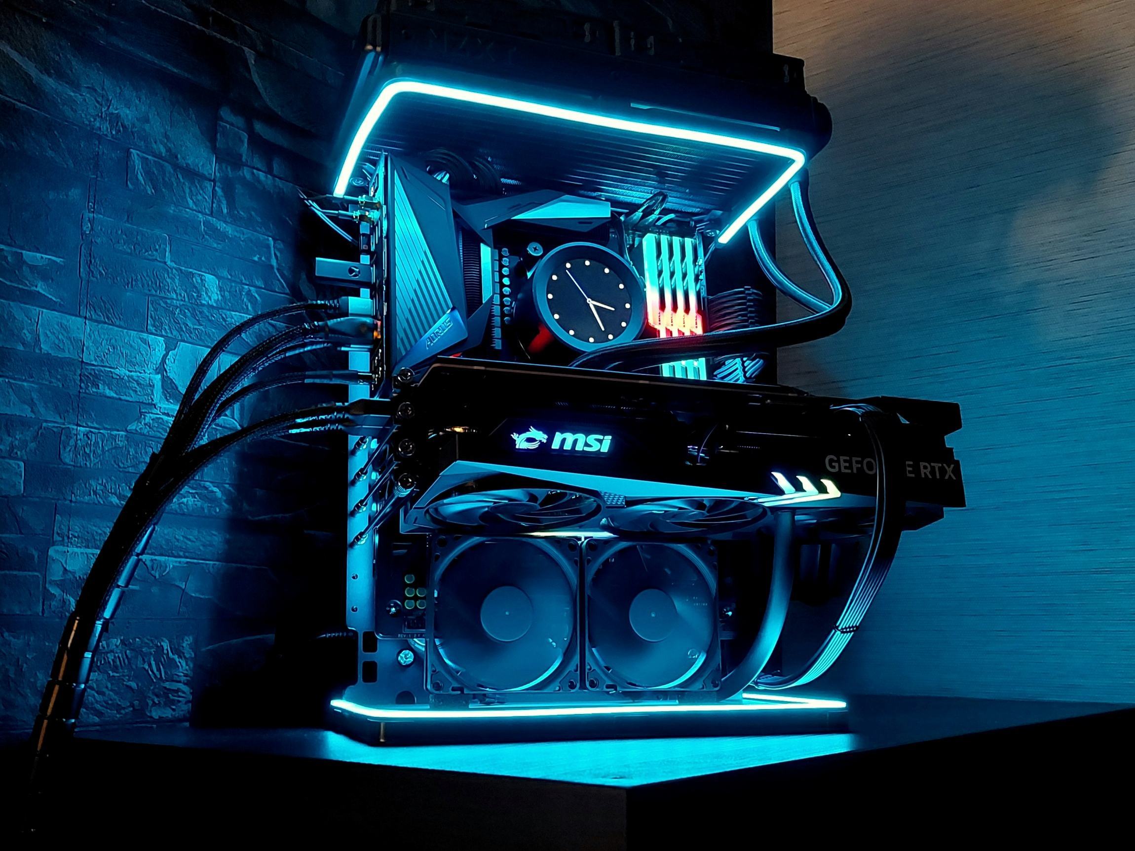 Vertikal macht der Benchtable optisch sehr viel her und ist somit auch als Open-Case für Nicht-Hardware-Tester sehr interessant. Insbesondere, weil die vertikale Montage auf der Homepage als neues Feature der verbesserten V2-Version angepriesen wird. Natürlich hätte ich den Radiator mit den Lüftern nach hinten montieren können. Jedoch möchte ich das nicht, weil mir das zum einen optisch nicht zusagen würde und zum anderen ich deutlich mehr Platz nach hinten haben müsste. Wie auf den Fotos zu sehen, möchte ich aufgrund meiner Kabel und der Optik das System nicht weiter nach vorne schieben. Wie das optisch dann mit den AIO-Schläuchen aussehen würde, weiß ich auch nicht. Im Video von Gear Seekers sieht das jetzt nicht so toll aus. Deswegen bleibt der Radiator vorne, die GPU-Blackplate freut's auch.