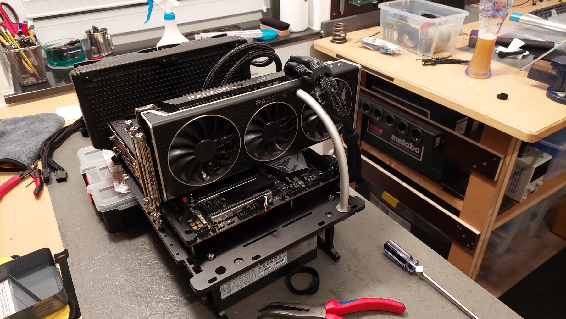 Wenn man alles montiert hat und den Benchtable vertikal aufstellt, bleibt er zwar stehen, aber es braucht nur ein winzig kleinen Schubser und das Ding fällt nach vorne. Ist so definitiv nichts für einen wackligen Tisch. Die Grafikkarte ist halt sehr groß (Länge 340 mm) und wiegt entsprechend. Deshalb habe ich mir unten kleine Füße angefertigt (auf den Fotos sichtbar), die das Kippen verhindern, was in der Praxis auch sehr gut funktioniert. Diesen Punkt hat BC1 im Email-Austausch auch bei mir angesprochen und empfehlen gegebenenfalls den Radiator nach hinten zu montieren. Um ehrlich zu sein, sehe ich diesen Punkt ein wenig kritisch.