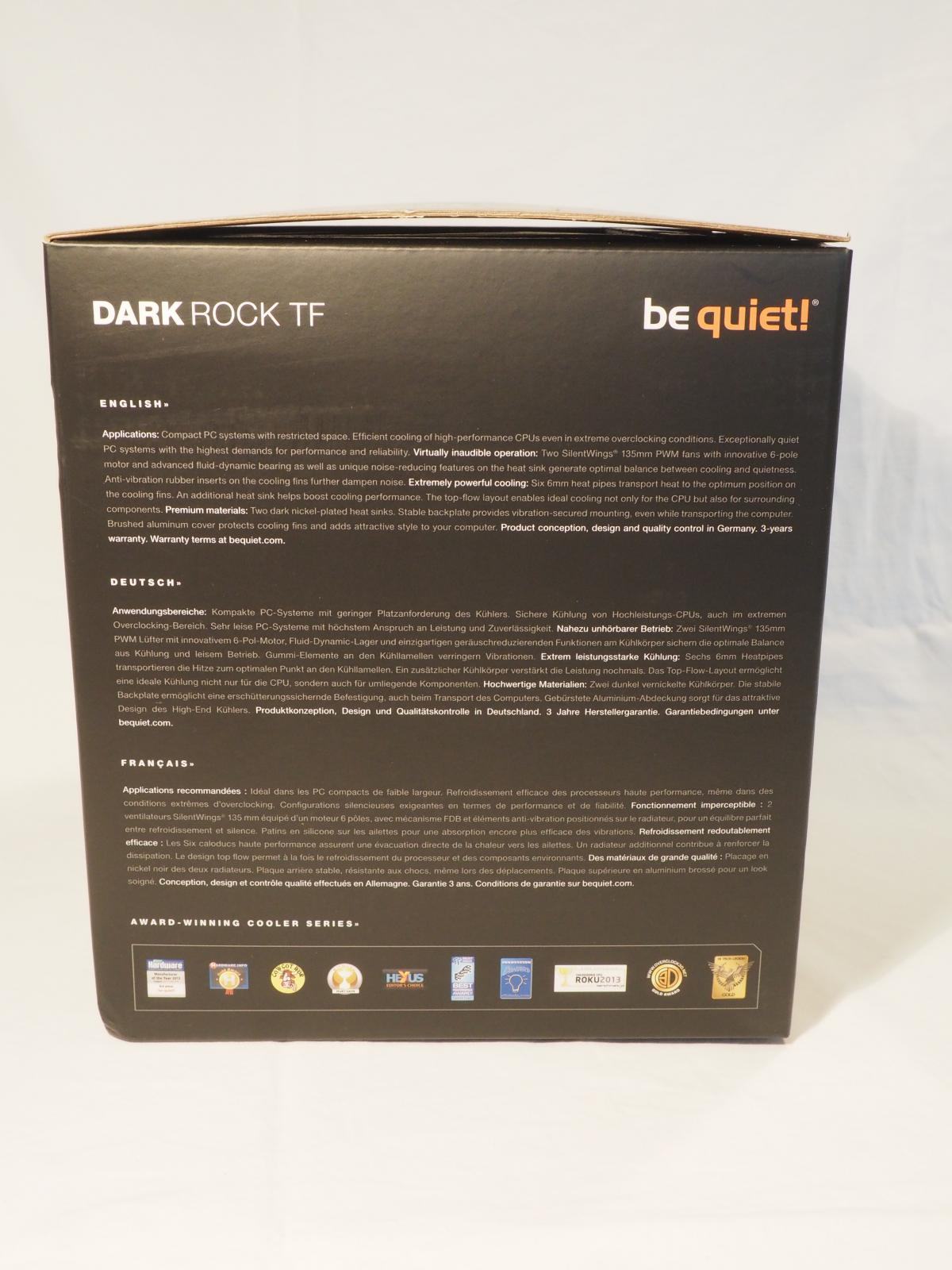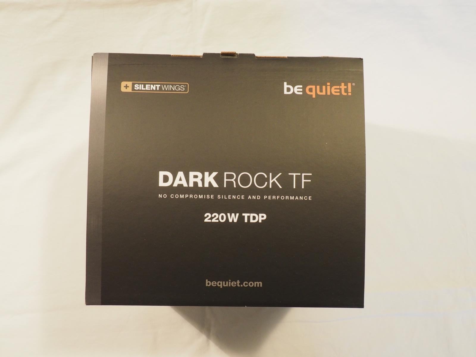 Die Oberseite zeigt mittig die Aufschrift DARK ROCK TF darunter no compromise silence and performance und noch eine Zeile tiefer 220W TDP. Ob diese Kühlleistung zu viel versprochen ist konnte ich mit meinen Mittel nicht prüfen aber die Ergebnisse umfassender Praxistests folgen.