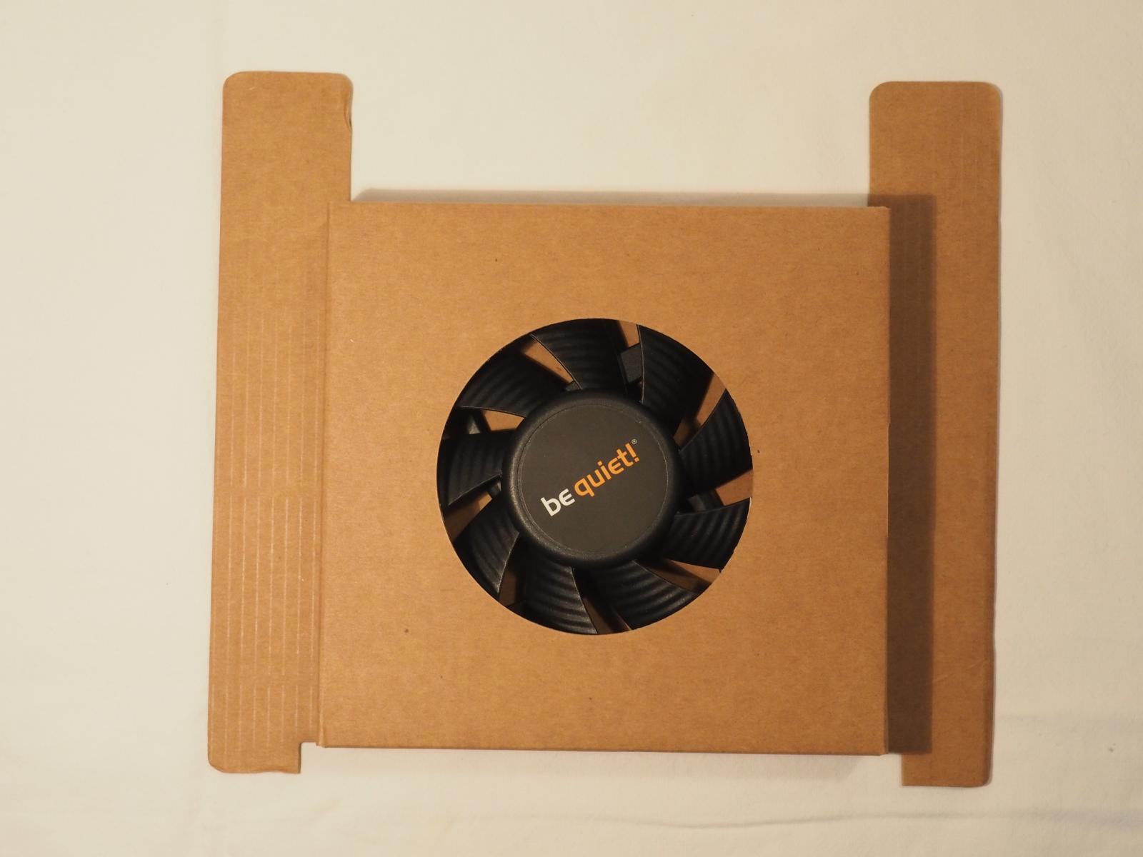 Der Lüfter besitzt gewellte Rotoren und ist komplett in schwarz gehalten. Mittig zeigt sich das be quiet! Logo.