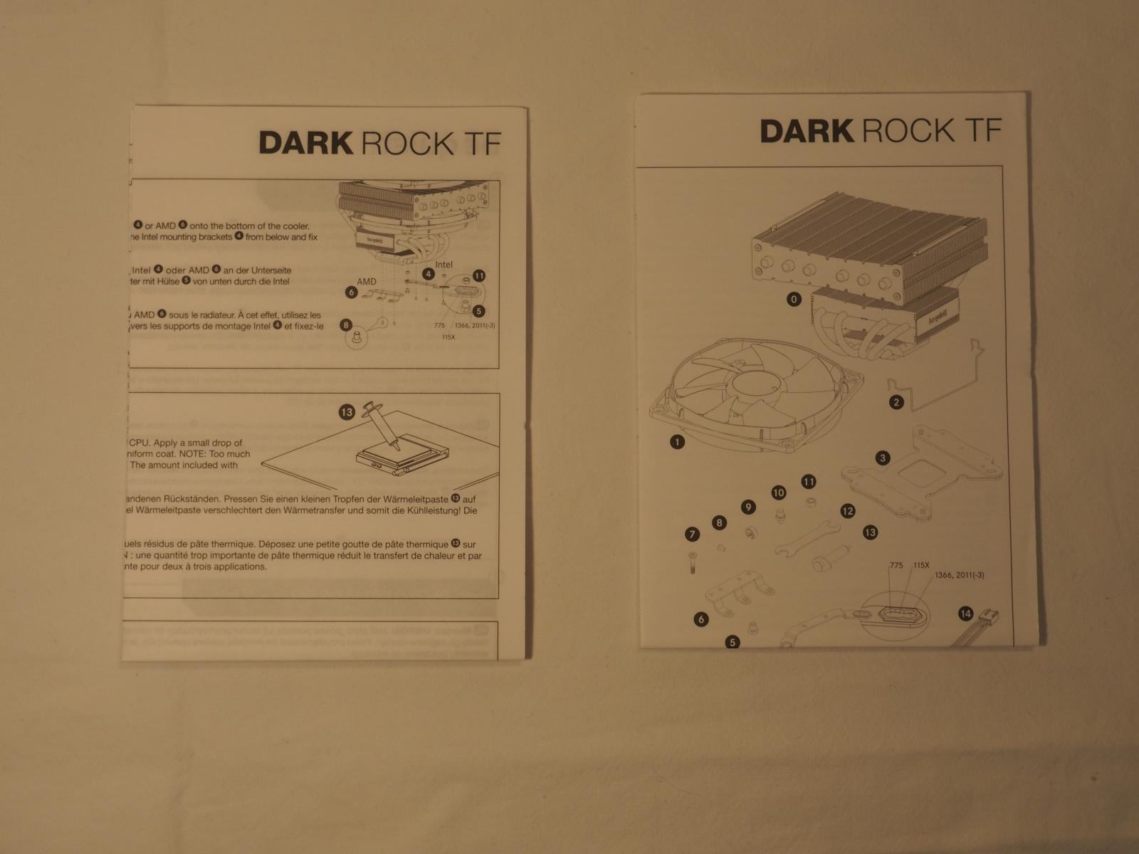 Unterhalb des Lüfters befinden sich zwei Anleitungen. Die eine enthält nur Garantieinformationen, eine Auflistung des Lieferumfangs und Explosionszeichnungen für verschiede Sockeltypen.