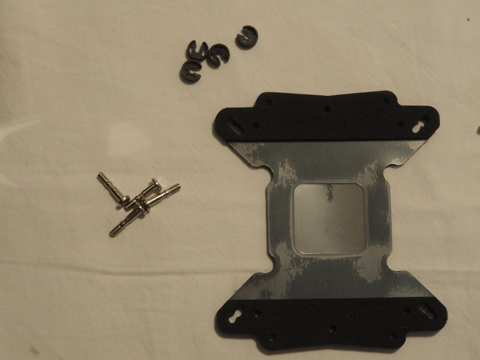 Nun müssen noch vier Sechskantmuttern mit Hülse an den Montagebrücken befestigt werden. In die Hülse schieben sich nachher die Spezialschrauben der Backplate, die dann nur noch festgezogen werden müssen. Anschließend wird die Schutzfolie abgezogen und die Wärmeleitpaste aufgebracht.