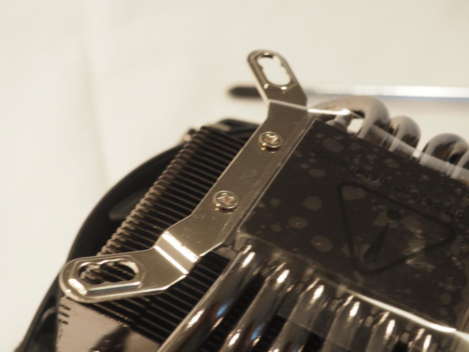 Im nächsten Schritt werden die Haltebügel am CPU-Kühler befestigt. Dazu dienen vier kleine Schrauben, für die der passende Schraubendreher wie erwähnt nicht beiliegt.