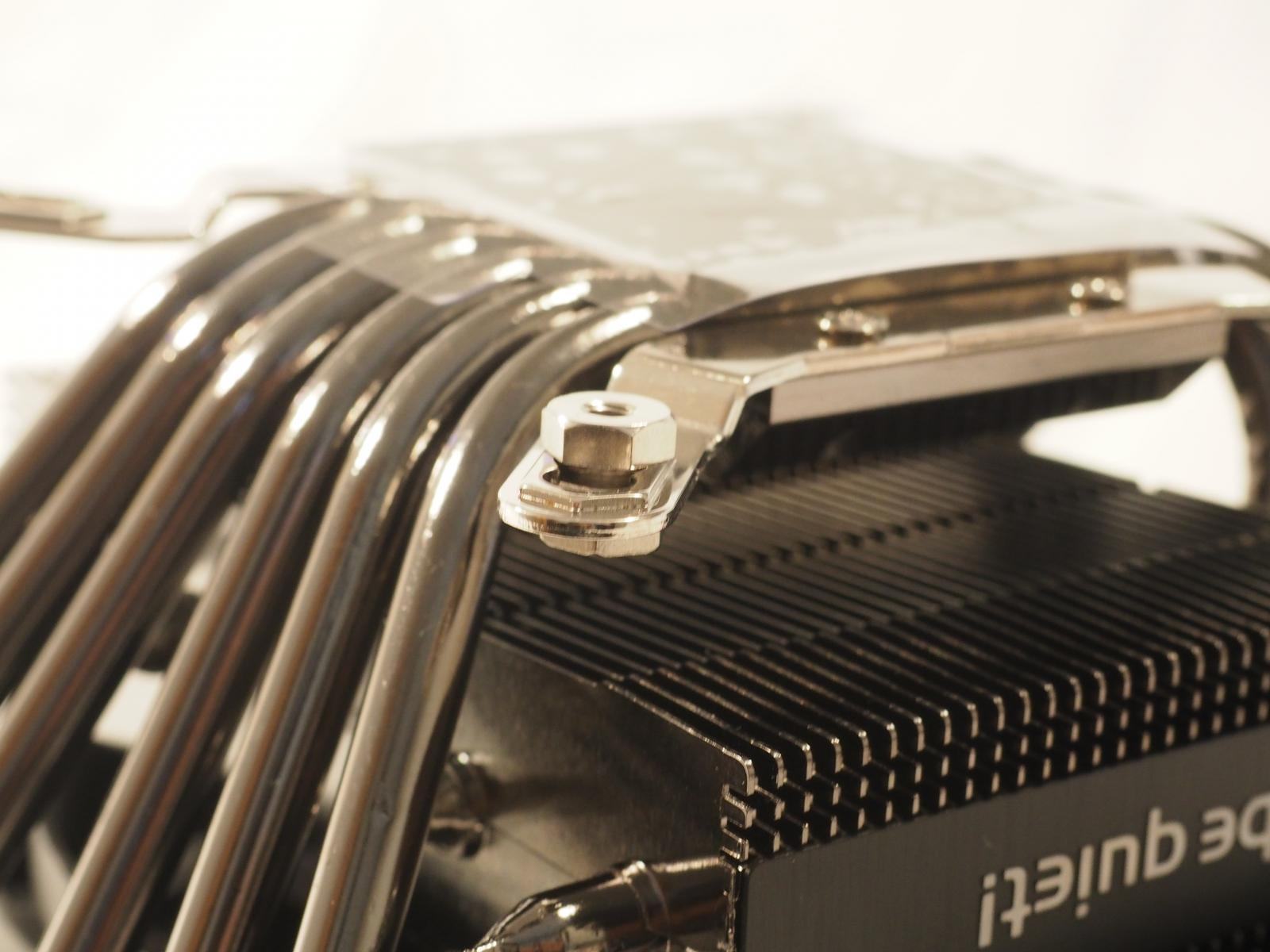 Der Kühlkörper besitzt eine große silberne Baseplate mit sechs Heatpipes die in zwei Kühlkörpern enden. Ein kleiner mit seitlichem be quiet! Logo auf schwarz eloxierter und gebürsteter Aluminiumplatte und ein großer weiter oben.