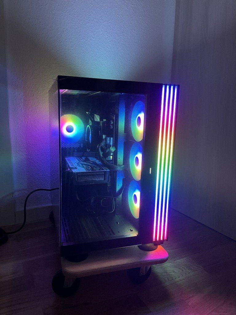 Die LED-Leiste, welche an der Unterseite, Front und Oberseite verläuft ist 1,33 m lang und umfasst insgesamt 77 LEDs, das Frontpanel ist clean verarbeitet mit einem großen, versenkten Powerknopf in der Mitte, 2 USB 3.2 Type A sowie einem USB 3.2 Type C Anschluss, einen Klinkenanschluss sowie einen Knopf für die RGB-Steuerung und einen Resetbutton. Die Verkabelung für das Mainboard ist im Gegensatz zu anderen Gehäusen statt lauter kleiner Einzelpinstecker ein Gesamtstecker für Power, Reset und die LEDs, womit man sich deutlich leichter tut man beim Verkabeln.