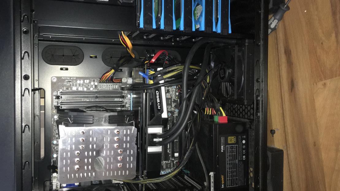 - Ist hinter dem Netzteil noch ein Loch im Mainboardtray? Wenn ja, das Front-Audio-Kabel durch dieses Loch führen und nicht erst über dem Mainboard entlang führen, dafür ggf. den Kabelbinder aufschneiden
