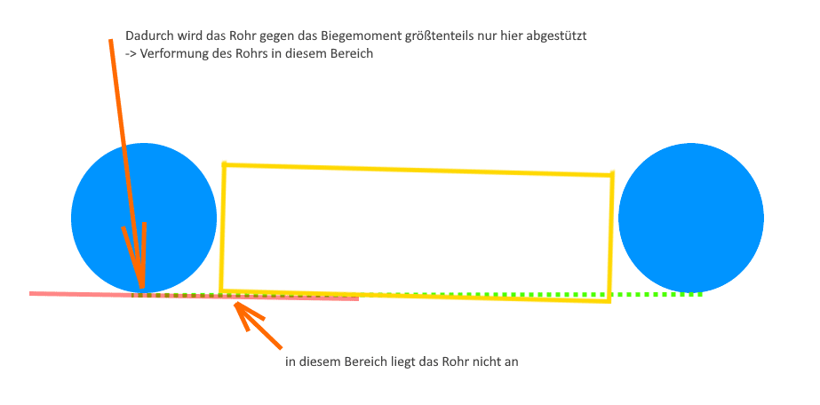 Gegen Ende ist es dann aber nur noch ein Moment, das durch eine einzelne Querkraft erzeugt wird. Nun liegt das Rohr aber auch flächig an, wodurch die Gegenkraft dann nicht mehr punktuell wirkt, was dann auch die Belastung reduziert und damit die Gefahr einer Druckstelle.
