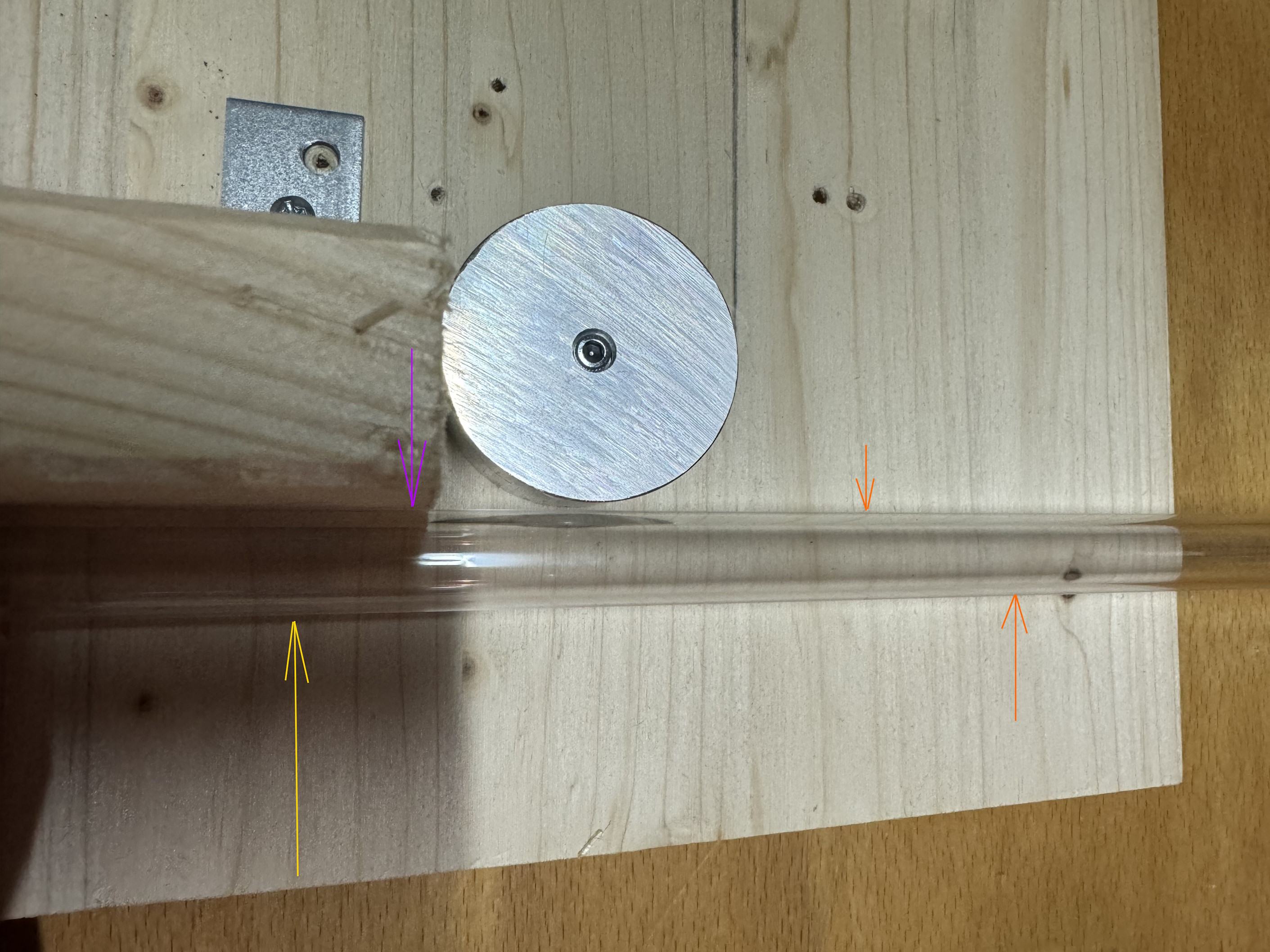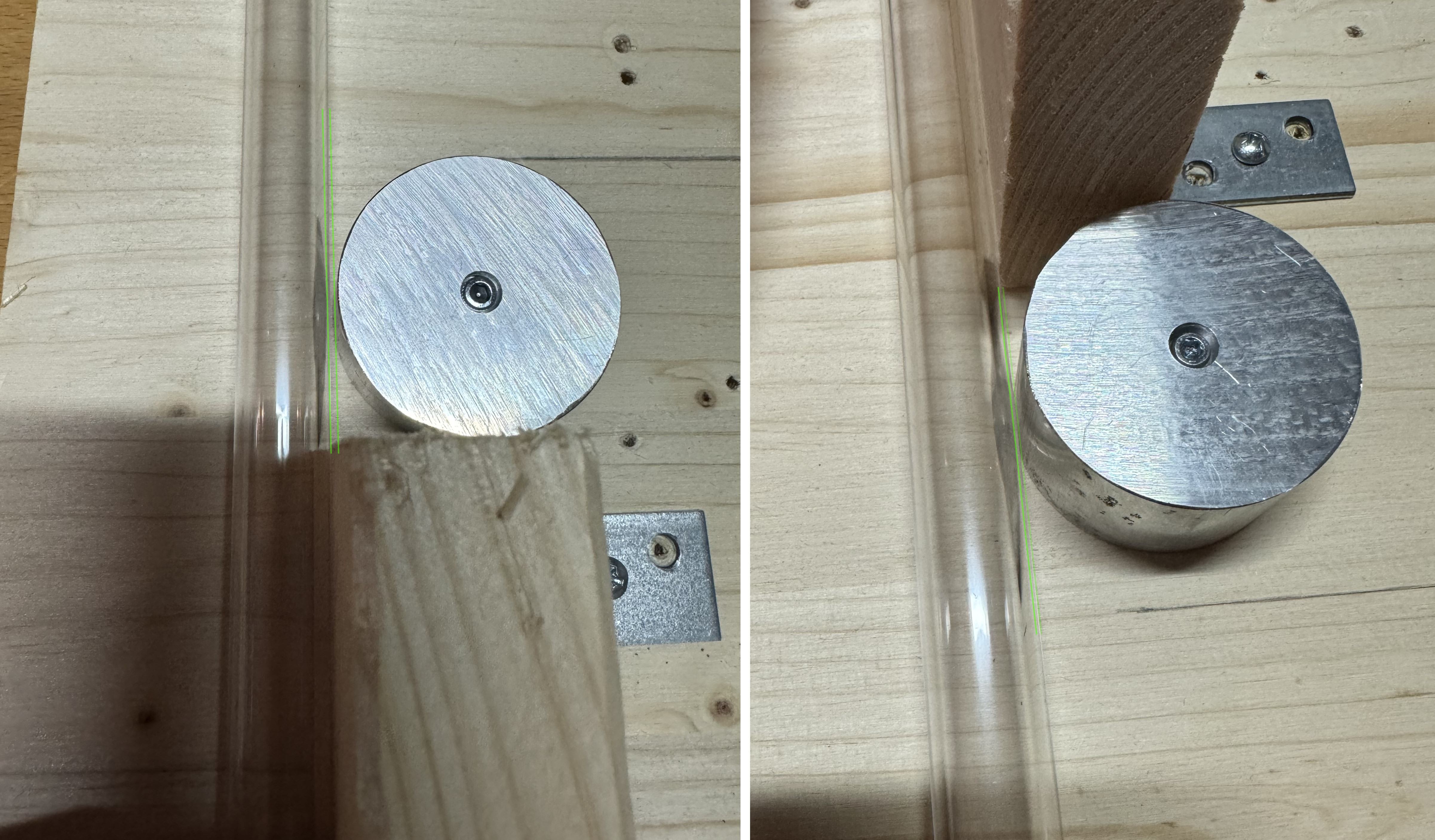 Ich habe dann stattdessen ein Rohr zum Ausrichten verwendet und zusätzliche das Kantholz so positioniert, so dass die tangentiale Verbindungslinie zwischen den Rollen etwas hinterhalb der Anlagefläche des Kantholzes liegt: