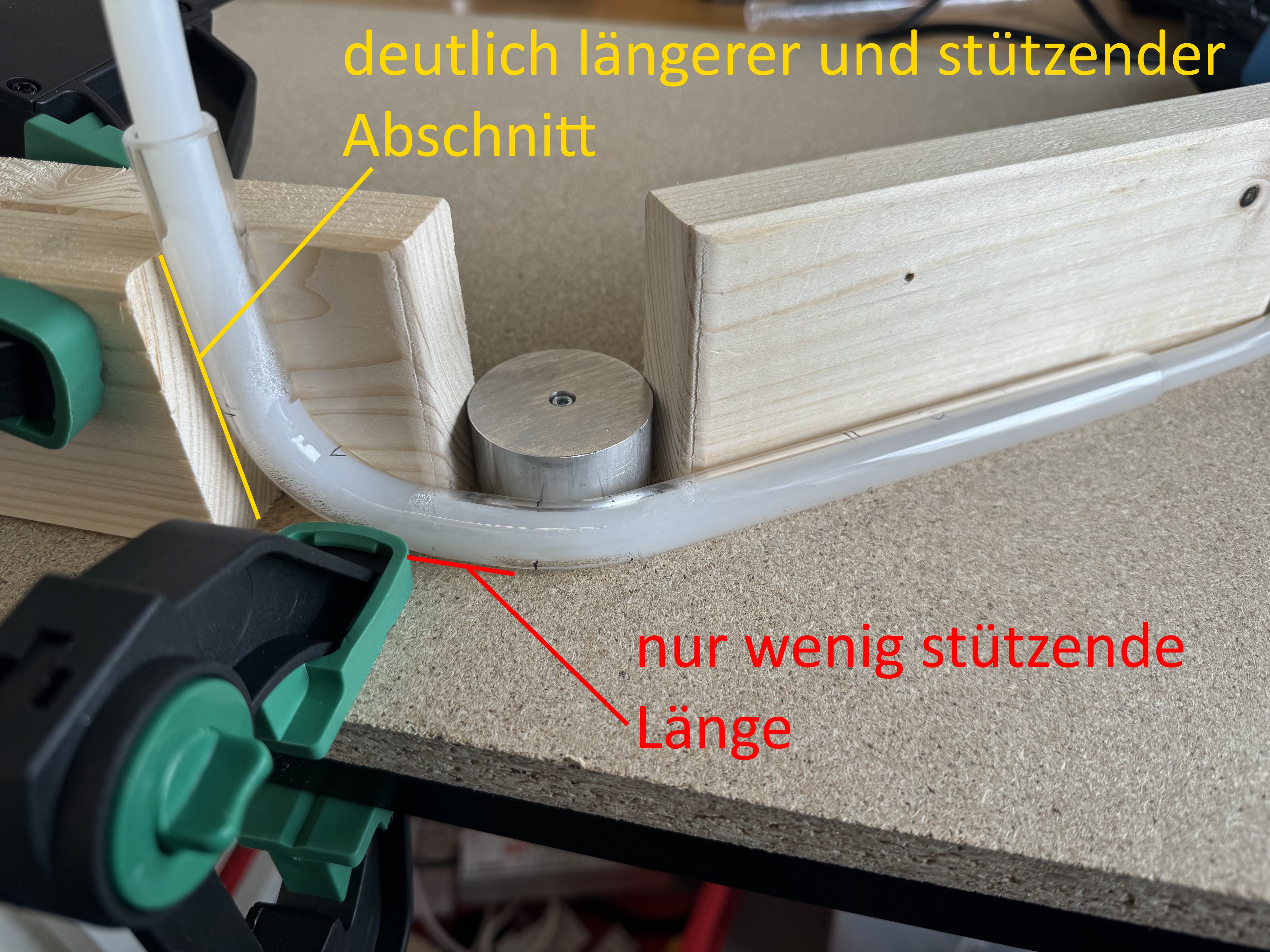 Der gelbe Abschnitt ist grob doppelt so lang wie der rote. Deshalb diese Reihenfolge. Je mehr Biegungen an einem Rohr vorhanden sind, desto mehr Winkel und Abstände müssen berücksichtigt werden um ein gutes Ergebnis zu erhalten. Deshalb hier nun beim letzten Bogen mehr Stützwirkung als beim zweiten (wobei es dort ja noch durch den senkrechten Anschlag ausgeglichen werden konnte).