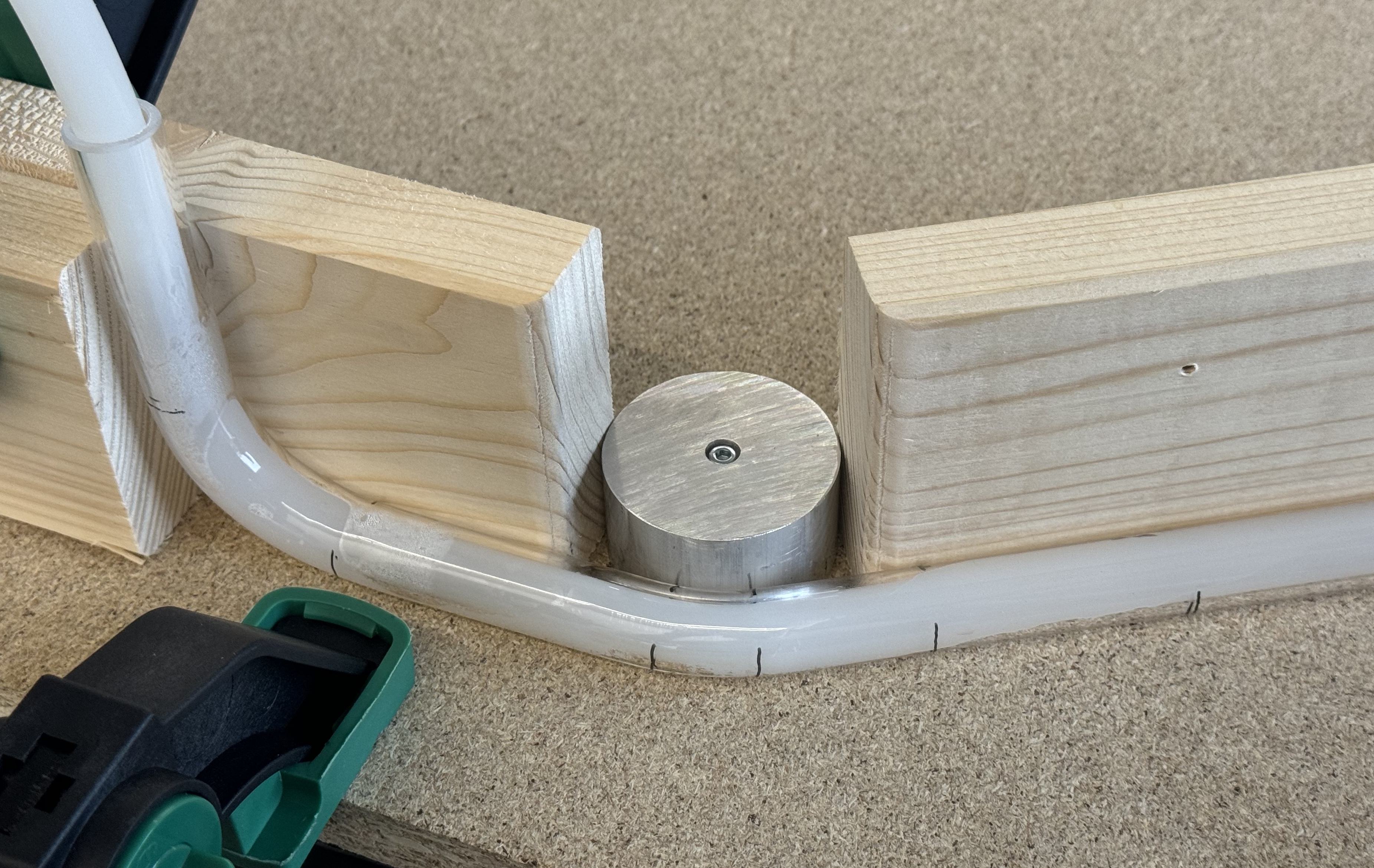 Als ich dann für dieses Rohrstück meine Biegehilfe neu aufgebaut habe, hab ich mir gedacht, ich setze jetzt das Kantholz und den Zylinder nochmal so, so dass es genau in einer Flucht liegt.
