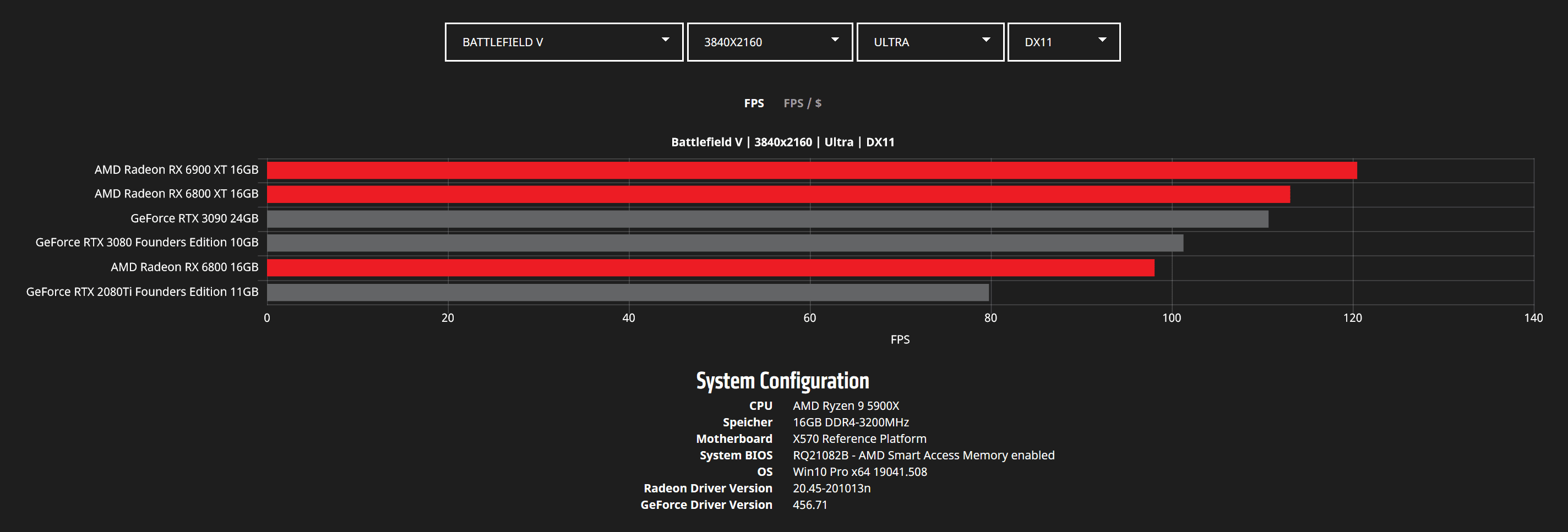 AMD hat unter untenstehenden Link nun detaillierte Benchmarks online. Holy Shit, sogar die 6800XT kommt in manchen Benches an die 3090 ran. Alle Benches sind mit SAM (AMD Smart Access Memory enabled) gemacht. Den Bench von BFV habe ich mal noch als Screenshot angehangen.