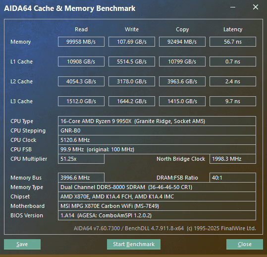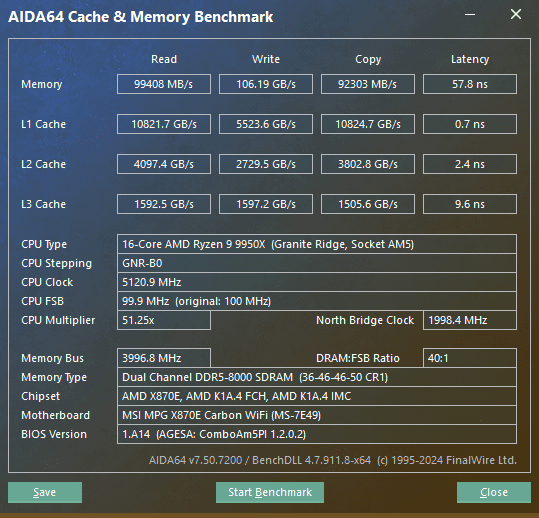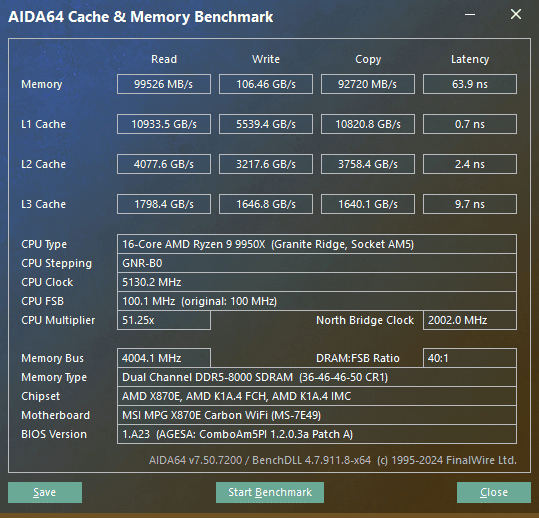 Benchmark results for a Micro-Star International Co., Ltd. MS-7E49 with an AMD Ryzen 9 9950X processor.