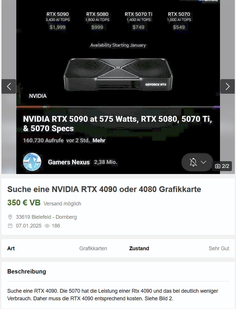 FG, MFG, DLSS4, Rohleistung etc. Alles in allem gefallen mir die Inserate auf Kleinanzeigen bis jetzt noch am besten. Mehr Immersion geht nicht.
