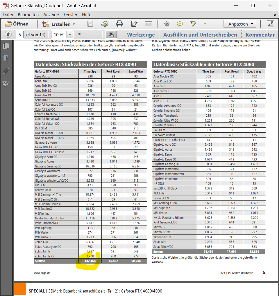 Weiterer Beleg, warum die Zahl 100.000 zu niedrig angesetzt sein muss, um welchen Faktor auch immer: In der 3DMark-Statistikauswertung zu Geforce zählten @ApolloX und ich gut 142.000 Accounts (anonymisiert), die innerhalb von 14 Monaten nach dem Ada-Launch mit der 4090 Time Spy gebencht hatten. Diese Zahl wiederum kann nur eine Teilmenge aller Exemplare sein, die da draußen werkeln.