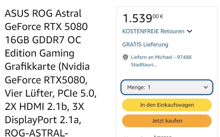Hab sie nach 15 Minuten aber wieder storniert. 1.500€ für eine 5080... Nein, ich warte lieber bis die 5090 anständiger verfügbar ist. Aktuell gibt es eh kein Spiel, das ich gerne spielen möchte.