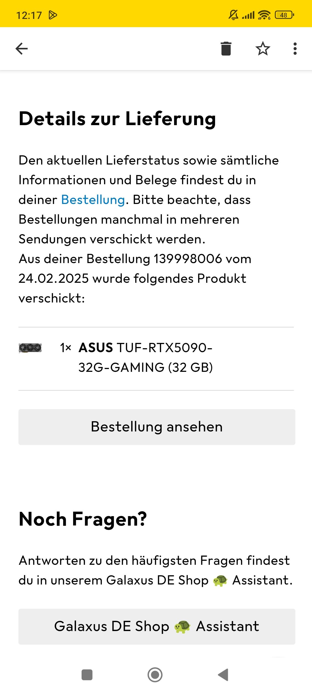 Meine 5090 TUF von Galaxus gestern ging durch. Wurde um halb 10 verschickt heute, sollte also morgen da sein. Schnell war ich nicht wirklich bei der Bestellung musste mich sogar noch bei PayPal anmelden.