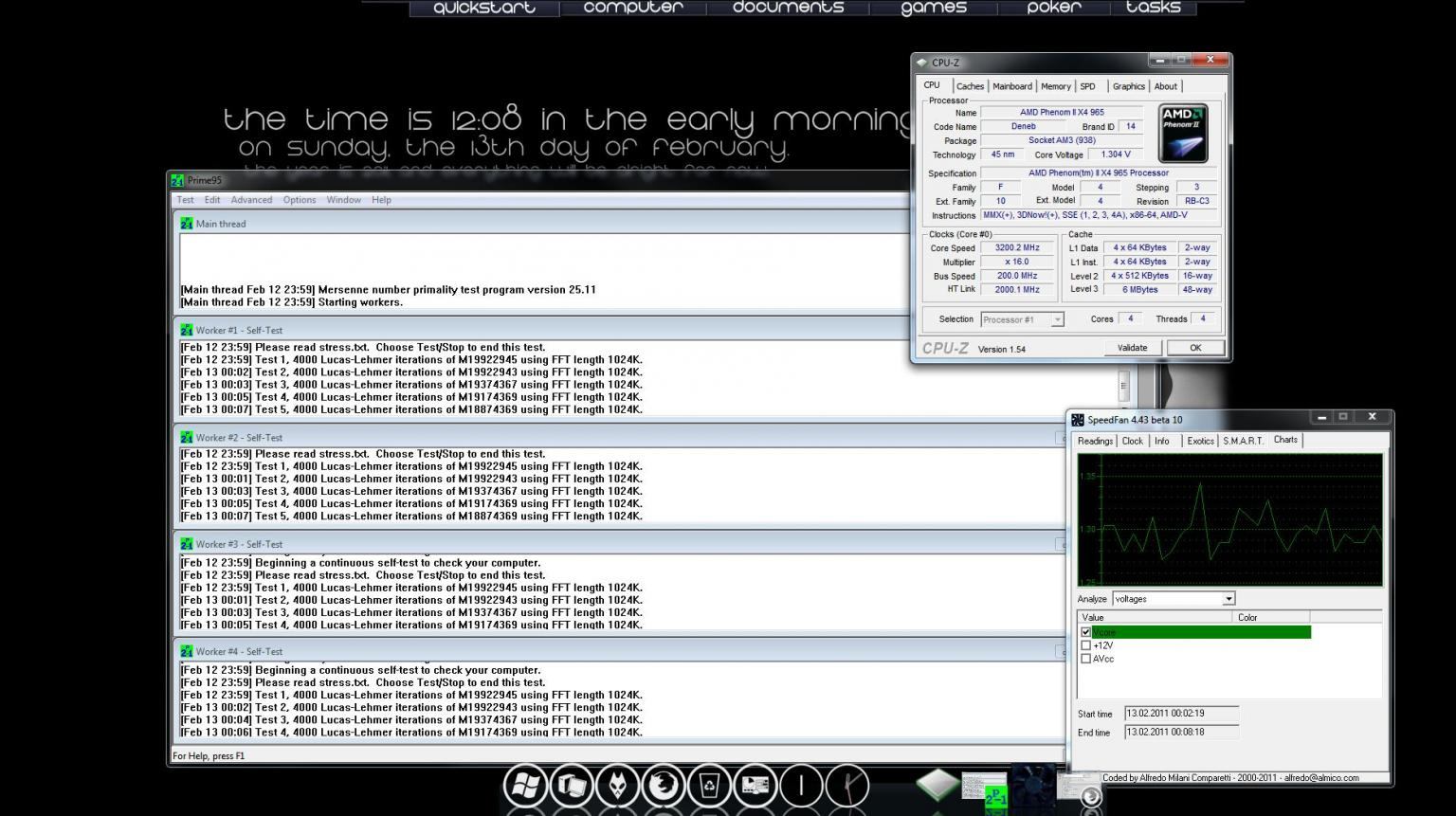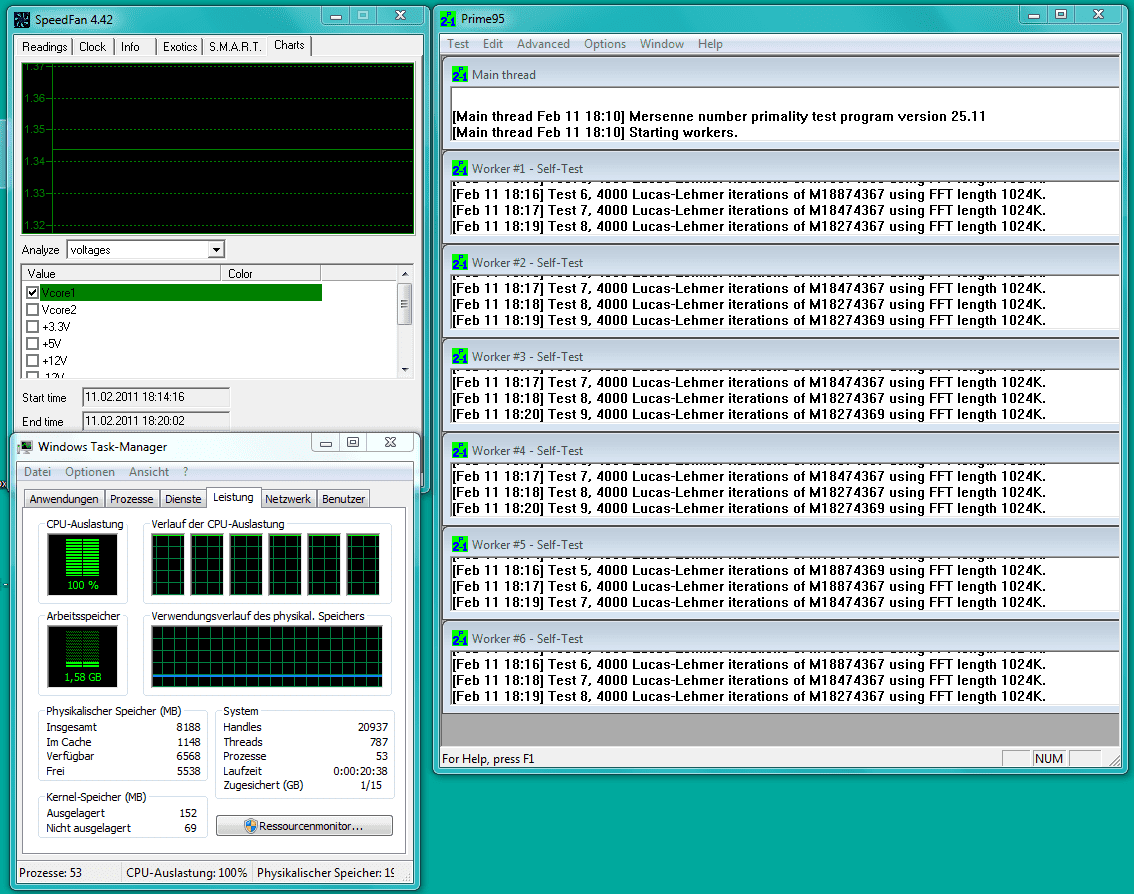 Wollte jetzt mal nach 10 Monaten überprüfen ob die Kühlung noch OK ist (oder evtl Wärmeleitpaste erneuert werden müsste oder sonstwas) und hab zu diesem Zweck mal wieder Prime 95 rausgekramt und mit dem Custom-Test (InPlace FFTs) meiner CPU ordentlich eingeheizt.