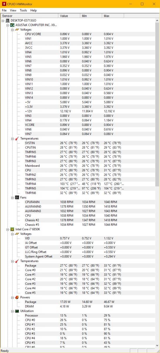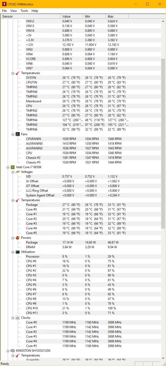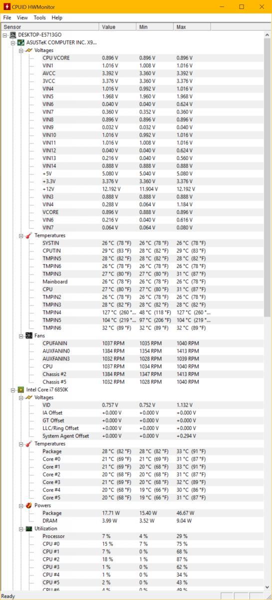 Dazu kommt noch, dass ich ca. 3-4 verschiedene CPU-Temperaturen habe. Z. B. "Package" in HWMonitor, "CPU" (Mainboard-Sensor?) und "CPU Package" (deutlich höher) in Aida. Gesehen habe ich auch schon noch ein VcoreRef oder so, ev. in HwInfo, in HWMonitor wäre das glaub ich "VIN5".