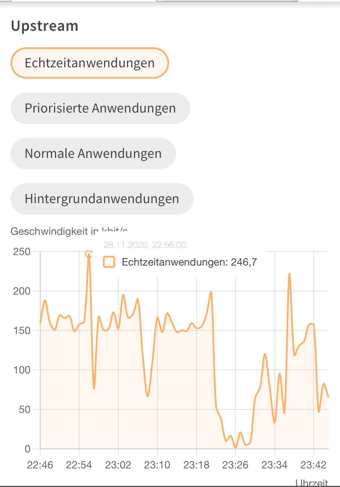 Z.B. bei der Einstellung 900/400 erhalte ich einen Bufferbloat Unloaded 16 MS, Download Active +31 MS, Upload Active +0...Speedtest Ookla gibt folgende bekannt: Downl. 870 Mbps, UP 384 Mbps, Idle Latency 7 MS, Down Latency 7 MS, Upload Latency 8 MS.