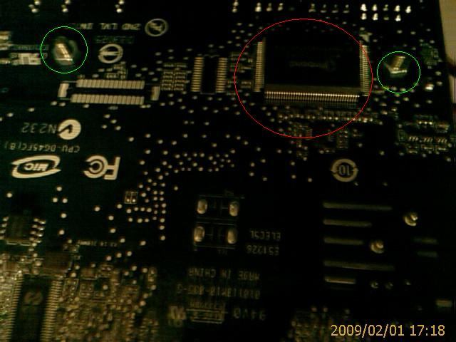 )Das IMAG0016.jpg zeigt den Chip auf der unterseite der Platine (roter Kreis der Chip und Grün 2 der CPU-Befestigungen)