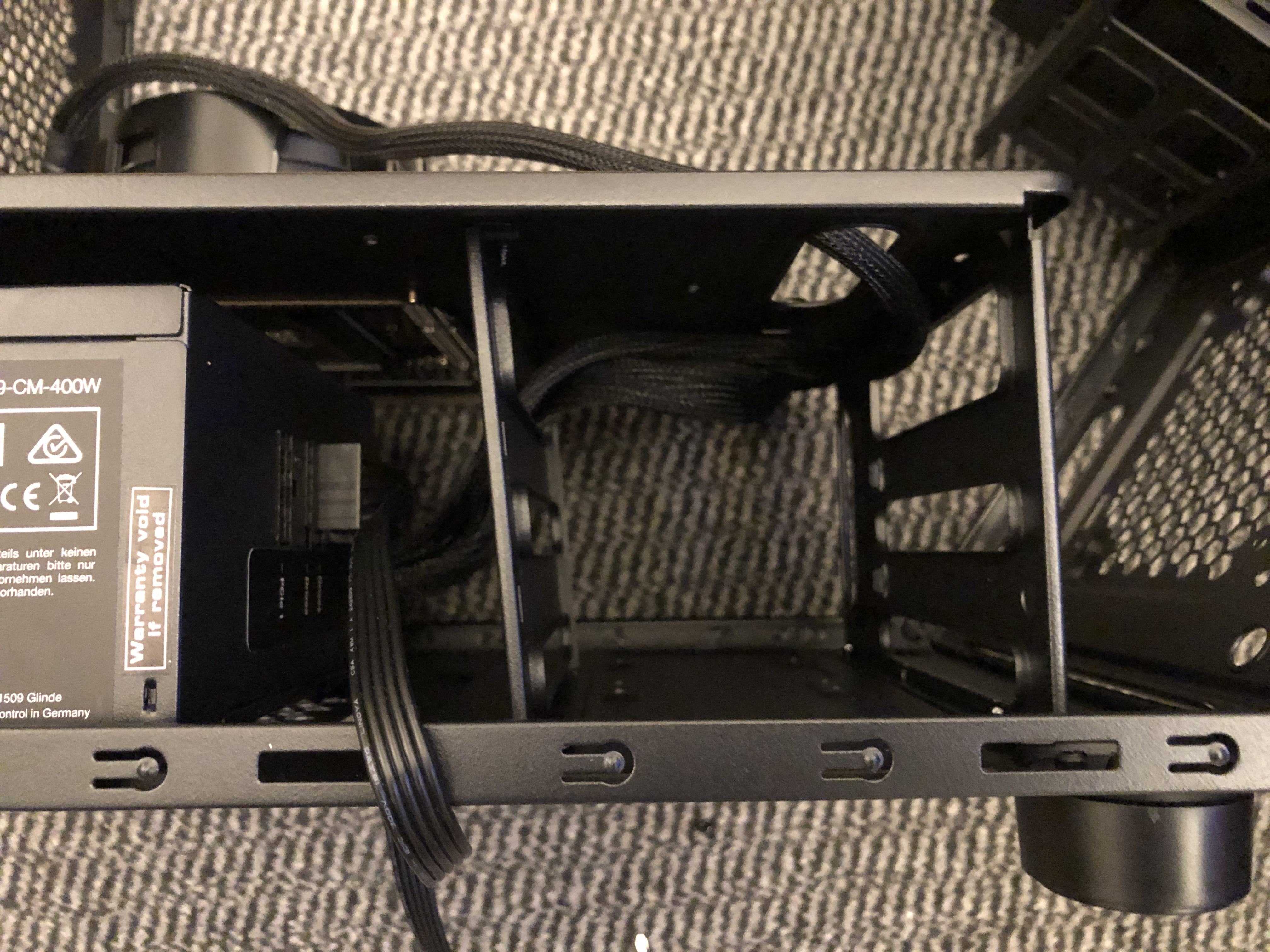 Das modulare Netzteil sollte man zuerst einbauen, da zwischen dem 160 mm langen Netzteil und dem 3,5“ Gehäusekäfig nur sehr wenig Platz ist. Bei einem modularen Netzteil sollte man die Kabel direkt anbringen, durch den geringen Platz zwischen Netzteil und 3,5“ Käfig bekommt man die Kabel nachträglich nicht mehr in das Netzteil eingesteckt und muss dafür den 3,5“ Käfig abschrauben. Bei einem nicht-modularen Netzteil stellt sich die Frage natürlich nicht, da muss man direkt schauen, wie man den Kabelstrang im Gehäuse unter bekommt. Verbaut man keine 3,5“ Platten könnte man die Kabel vom Netzteil in dem Käfig unterbringen. Auch schien das Gehäuse im Netzteilschacht nicht ganz eben zu sein, trotz zweimaligem Einsetzen des Netzteils saß es leicht schief im Schacht, so dass das Anbringen der Schrauben etwas umständlich war.